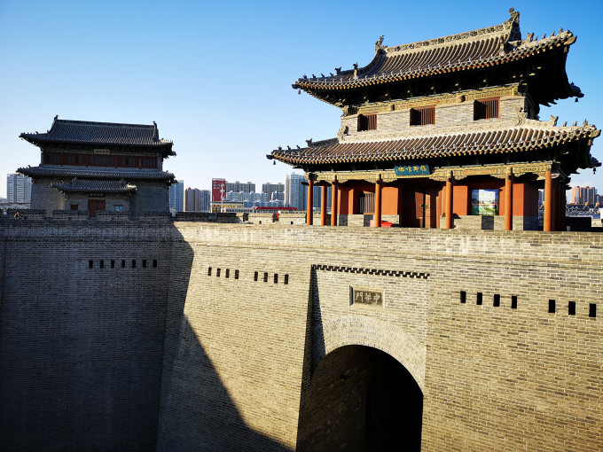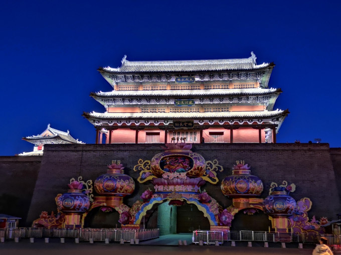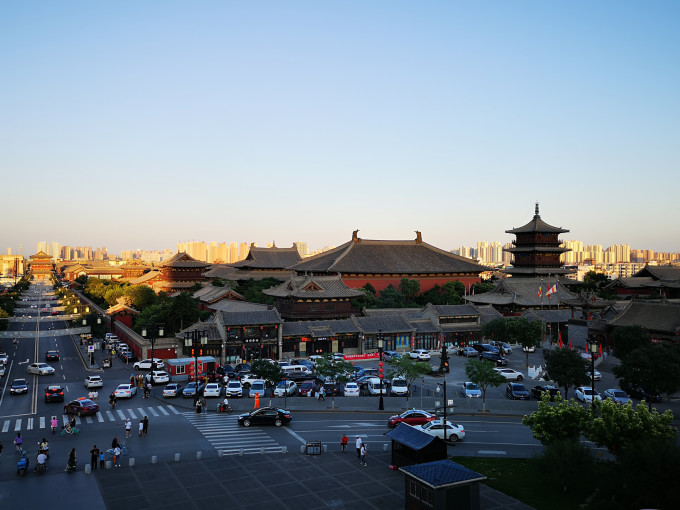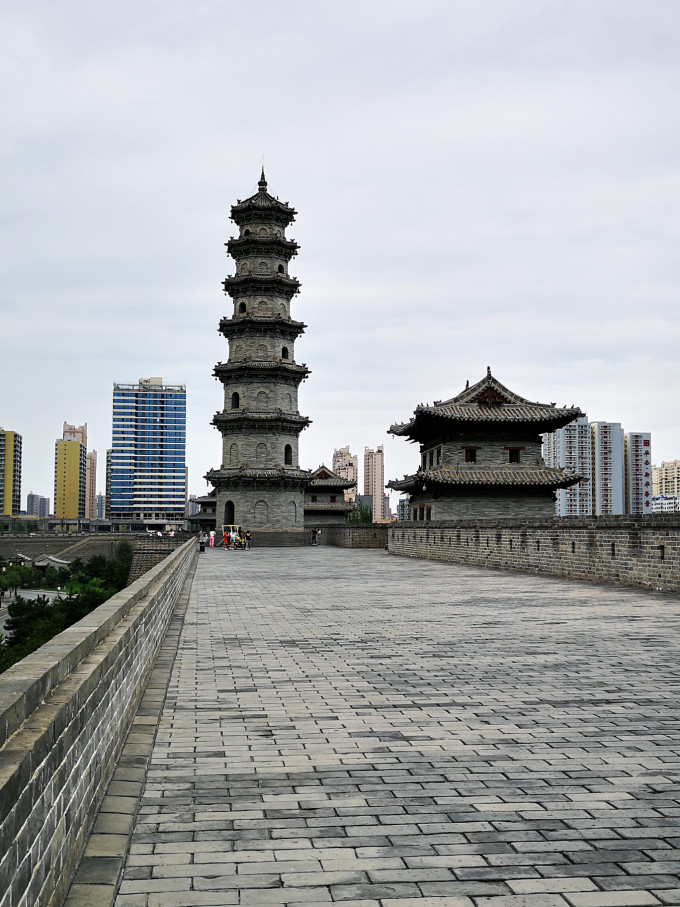 回去是下午5点,到大同古城西北角的乾楼打卡。顺着城墙向东来到城内,登临北门武定门。城墙是免费的,只要扫一下游山西的二维码即可登城,夜间开放至23点。