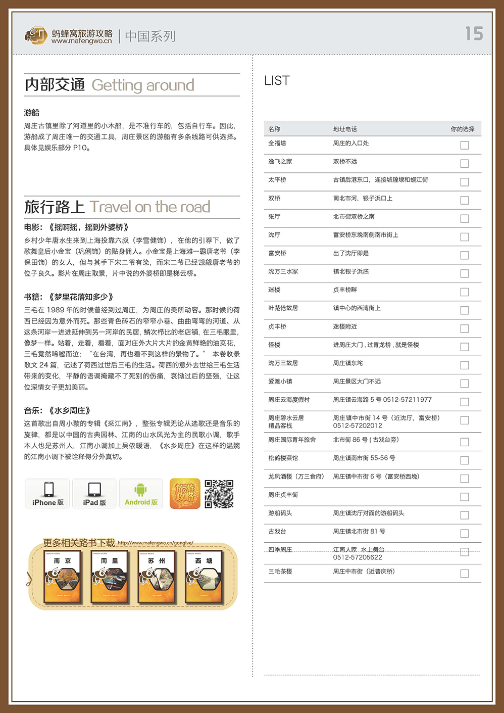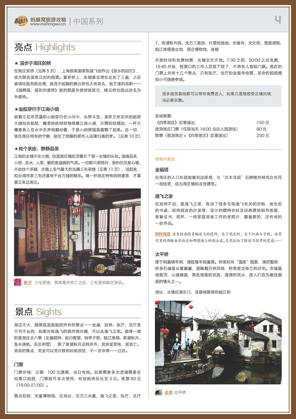 简介唐风孑遗,宋水依依,烟雨江南,碧玉周庄。千年历史沧桑和浓郁吴地文化孕育的周庄,以其灵秀的水乡风貌,独特的人文景观,质朴的民俗风情,成为东方文化的瑰宝。全镇依河成街,桥街相连,深宅大院,重脊高檐,河埠廊坊,过街骑楼,穿竹石栏,临河水阁,一派古朴幽静,周庄还保存了14座各具特色的古桥,共同构造了一幅美妙的“小桥、流水、人家”的水乡风景画。