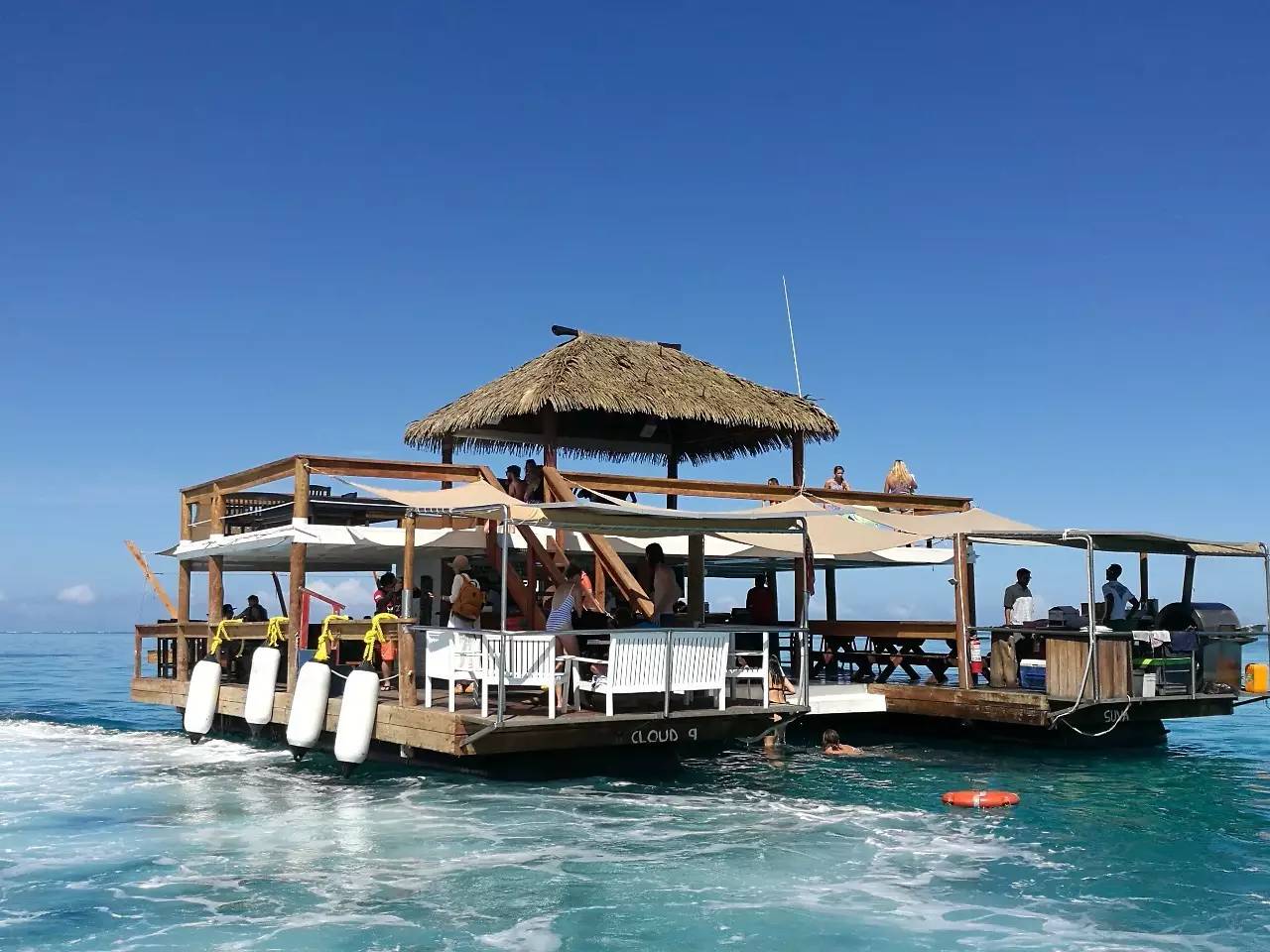 它漂浮在斐济的马马努卡群岛附近,整个独特的场地遍布环绕声系统、阳光甲板、吊椅和日光椅,而除了可以在此享受美酒佳肴以外,还可以游泳、浮潜、冲浪~~酒吧分为两层CLOUD9附近的水域非常好,可以趁机浮潜~~~一边吃明火烤披萨,一边跟着电影在甲板上跳舞,周围是一望无际的翡翠色大海,简直太棒了