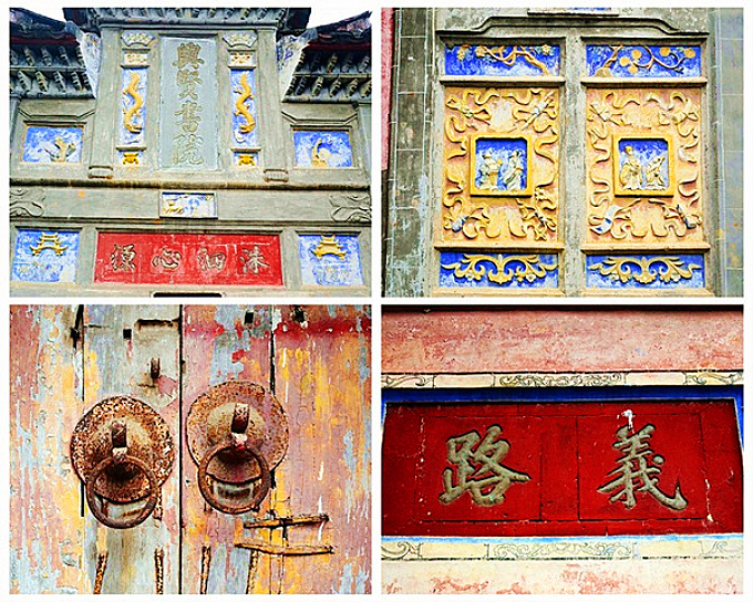 兴贤古街里,由于历史的沉淀,大多的古建筑多为灰白色,只有兴贤书院的门楼,被涂为红、黄、蓝等多种色彩,使这座书院建筑显得更为突出,更加精美艳丽。