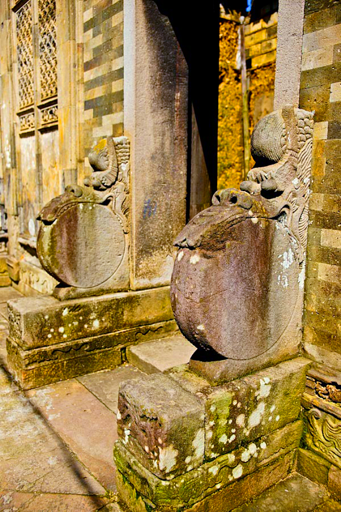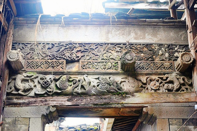 面壁砖浮雕有人物故事、祥禽瑞兽等,形制优美、工艺精湛。内部屋宇梁柱壮实,窗长梁托雕刻精巧。
