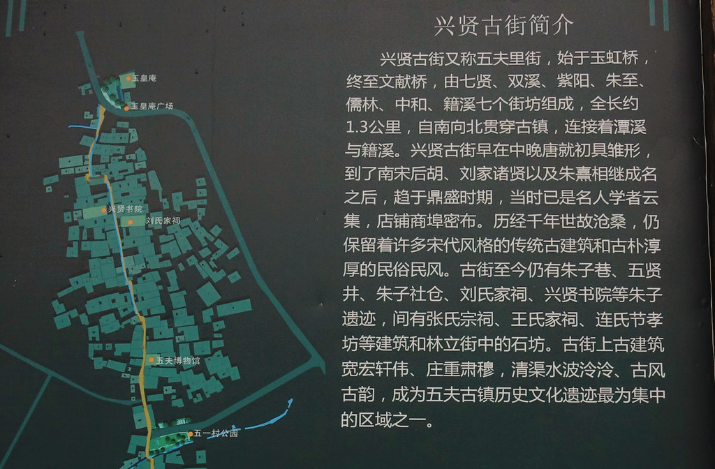 行走于兴贤古街,街中牌坊林立,石坊门上分别镌刻着“崇东首善”、“五夫荟萃”、“天地钟秀”、“籍溪胜境”、“ 紫阳流风”、“三峰鼎峙”、“三市街”、“过化处”、“天南道国”、“邹鲁渊源”等历史名人的手书横额。