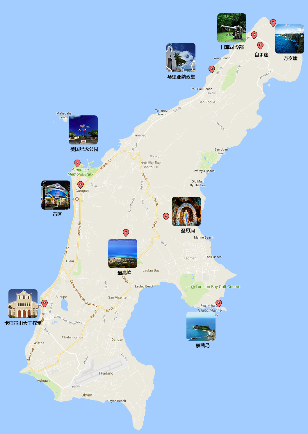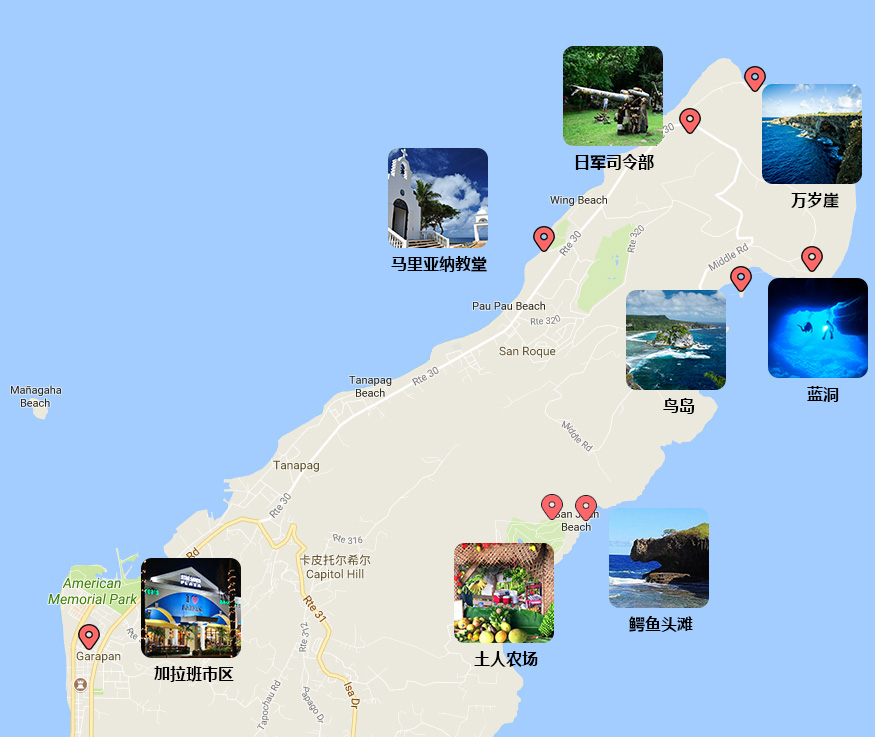 从市区出发-(自驾15min)-【日军司令部 30mim】-(自驾5min)-【万岁崖 30min】-(自驾15min)-【蓝洞 30min】-(自驾5min)-【鸟岛 30min】-(自驾15min)-【马里亚纳教堂 30min】(自驾40min)-【土人农场 30min】-(自驾5min)-【鳄鱼头滩 60min】-(自驾40min)-市区