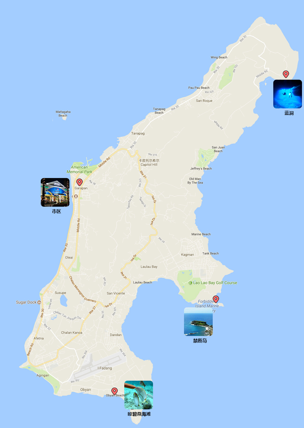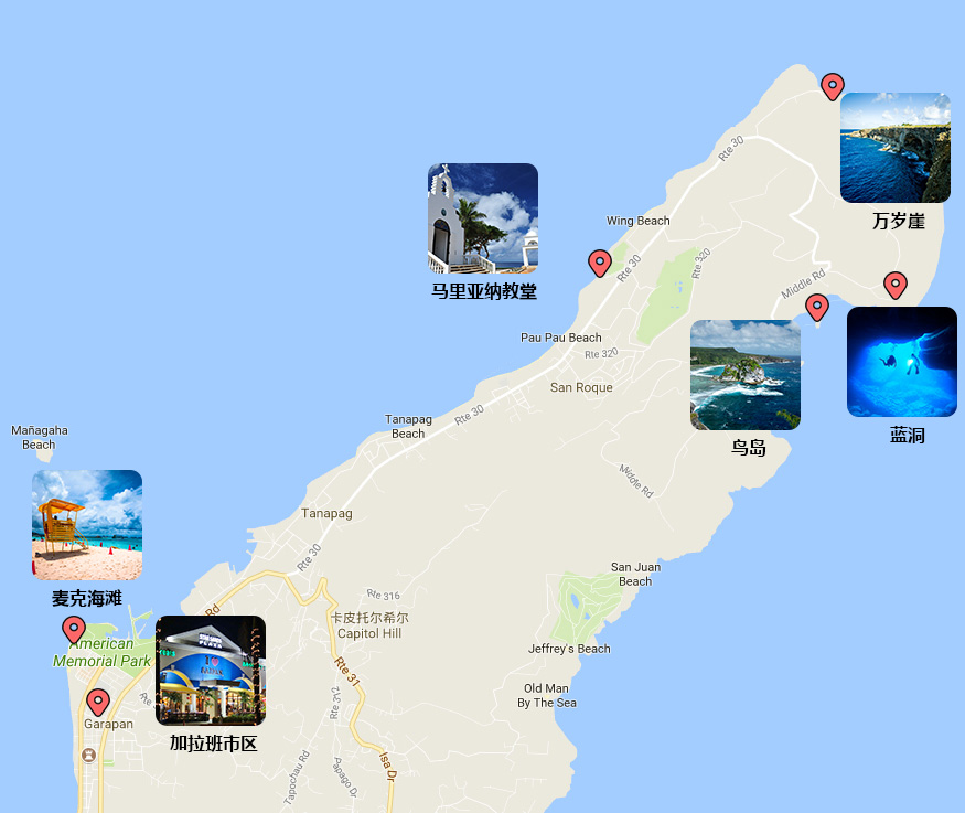 从地图上看 整个塞班的自驾区域可以分为3个部分:北部景点、南部景点、市区