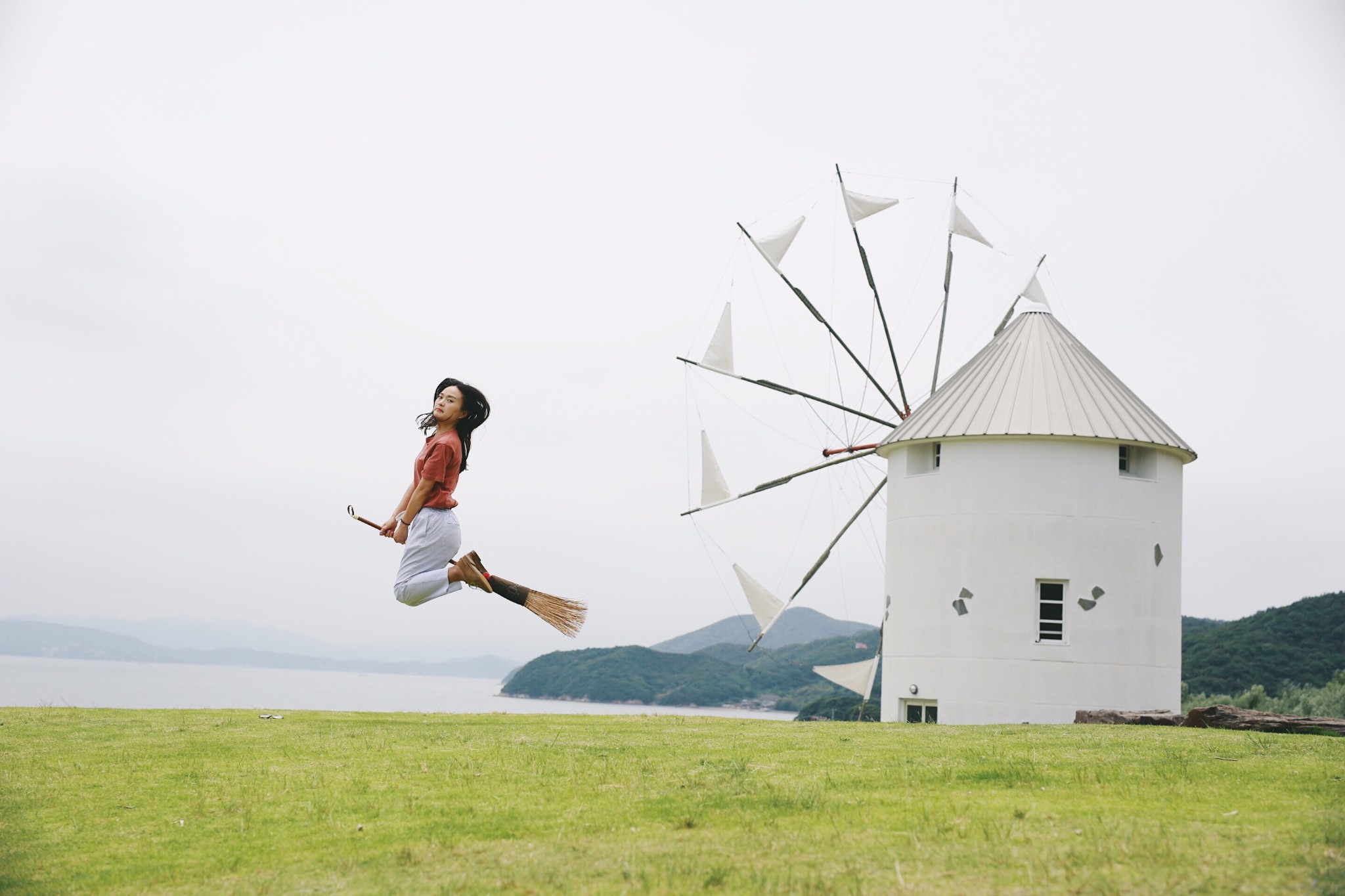 橄榄园里的大风车,像宫崎骏动画里的场景,风车面向着大海,视野开阔,拍照视角很好,有人用扫把假扮小魔女,立刻就有了《魔女宅急便》的既视感。