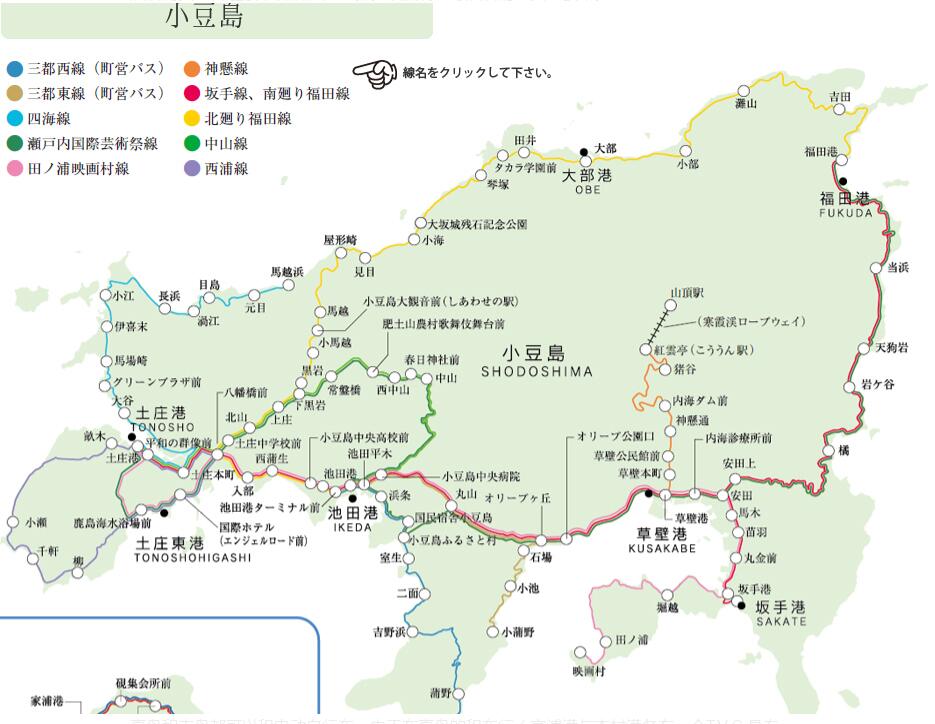 》部分线路交通时刻表: オリーブ公園、草壁港経由(土庄港発)→二十四の瞳映画村、坂手港、福田港方面(http://www.shodoshima-olive-bus.com/dia/dia_w-fukuda-dn4.pdf) ;二十四の瞳映画村、坂手港、福田港→草壁港、オリーブ公園方面(土庄港着)(http://www.shodoshima-olive-bus.com/dia/dia_w-fukuda-up4.pdf) ;草壁港発⇔紅雲亭着(寒霞渓)(http://www.shodoshima-olive-bus.com/dia/dia_kankake.pdf)