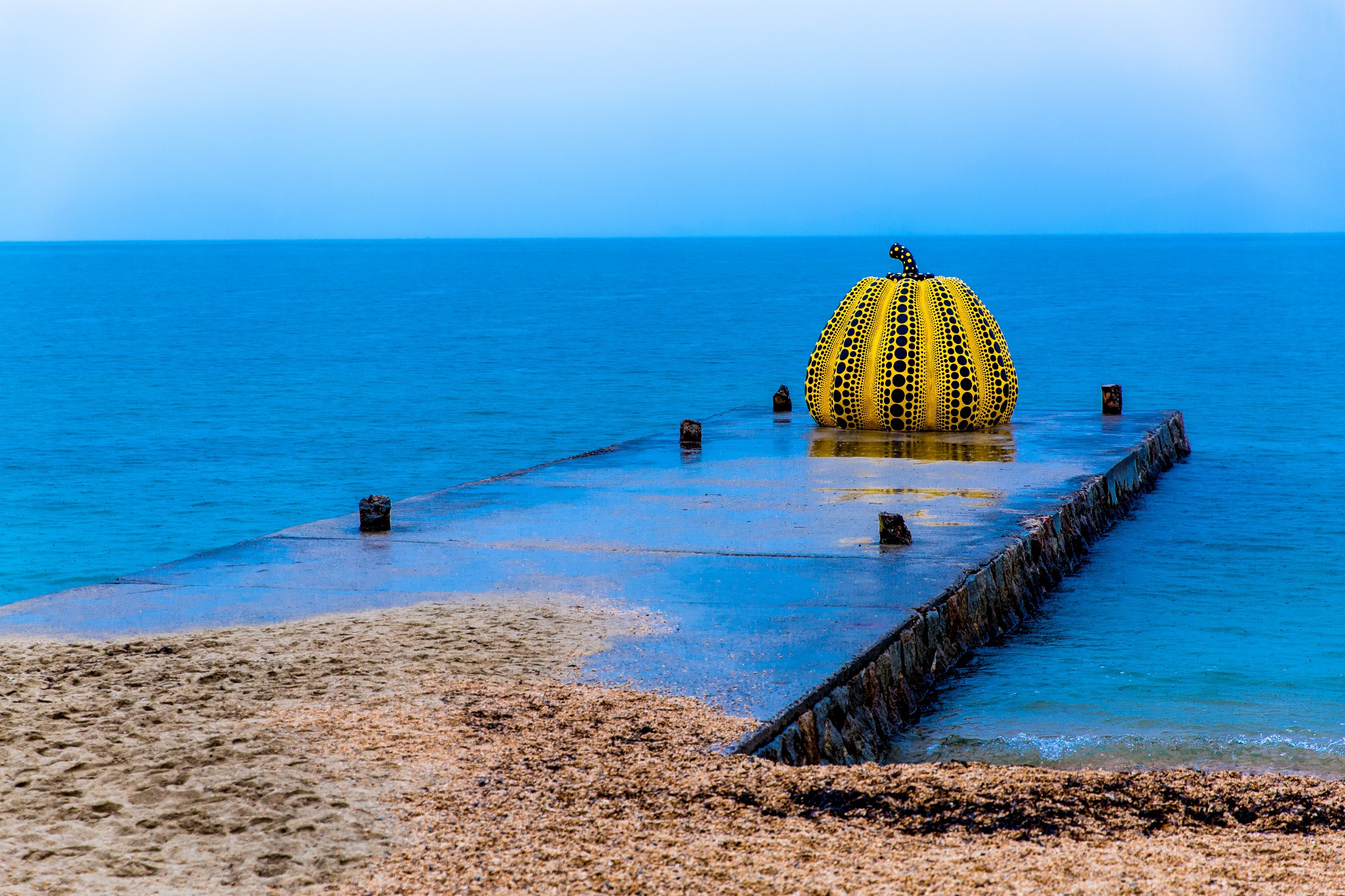 红南瓜在宫浦港附近,南瓜的黑色圆点挖空了,变成了人可以随意进出的洞口。南瓜内部还有彩色斑点投射到地面,像个彩色的泡泡梦。