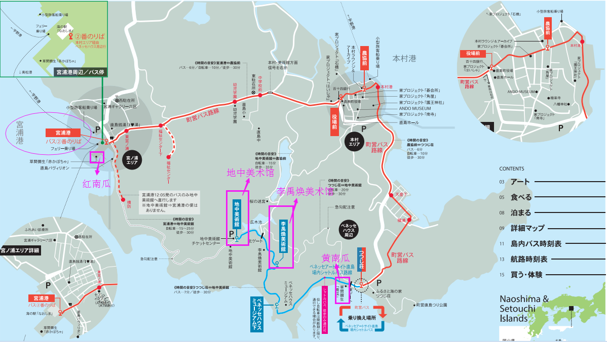 》Shuttle Bus:Benesse House区域的免费接驳车。衔接Town-bus的站点“Tsutsuji-so”(つつじ莊),经停:Benesse House Museum、李禹焕美术馆、地中美术馆。点击:Shuttle Bus时刻表(http://benesse-artsite.jp/uploads/access/BASN_bus_timetable_20170301-.pdf)