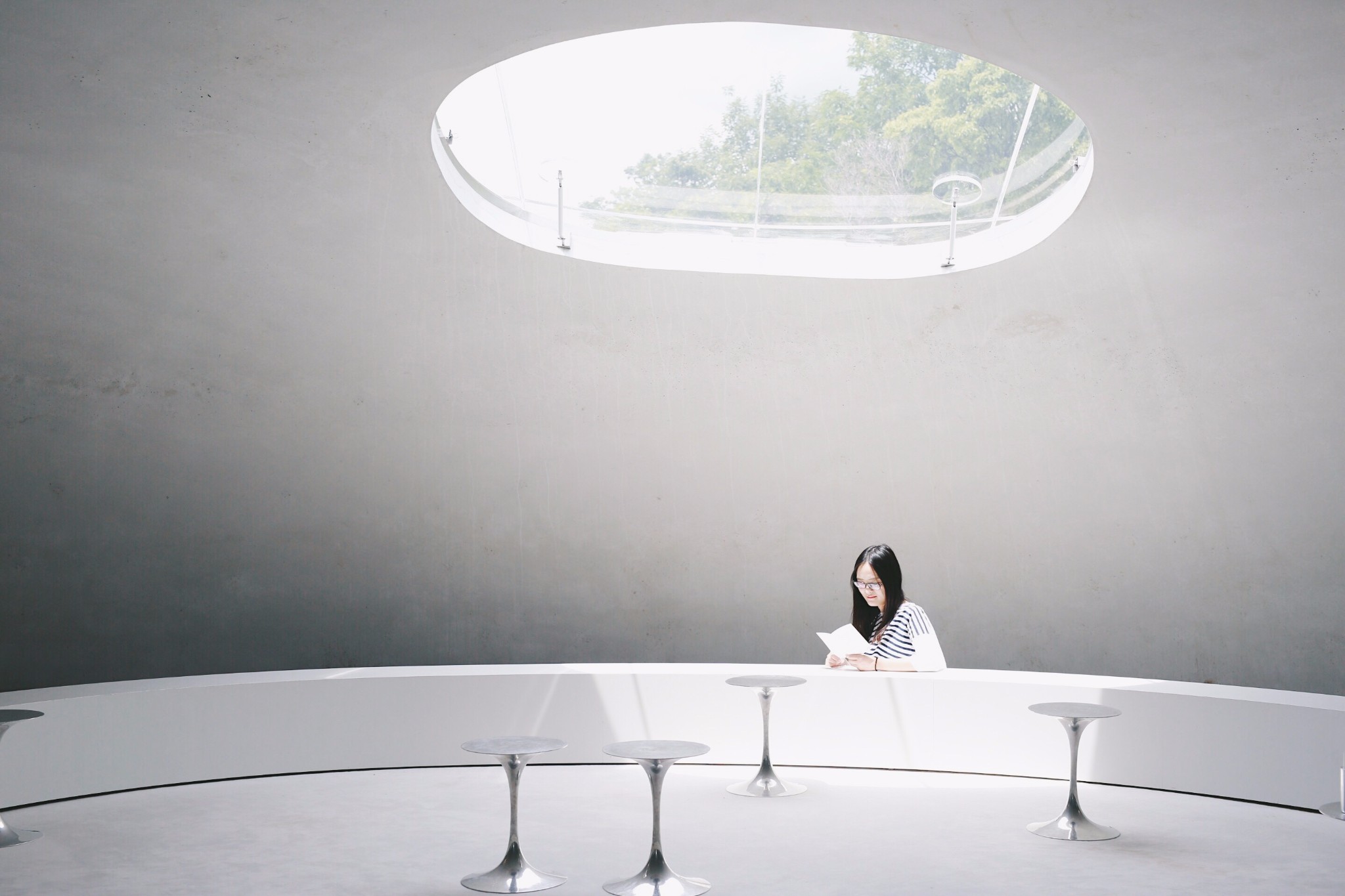 美术馆的圆形天窗如同一个大舞台,阳光透过空洞洒落、云朵从头顶飘过,雨水滴滴答答地落在地板上,伴随四季交替轮回、风雨倏忽变幻,每个时刻欧赋予公众全新的参观体验。