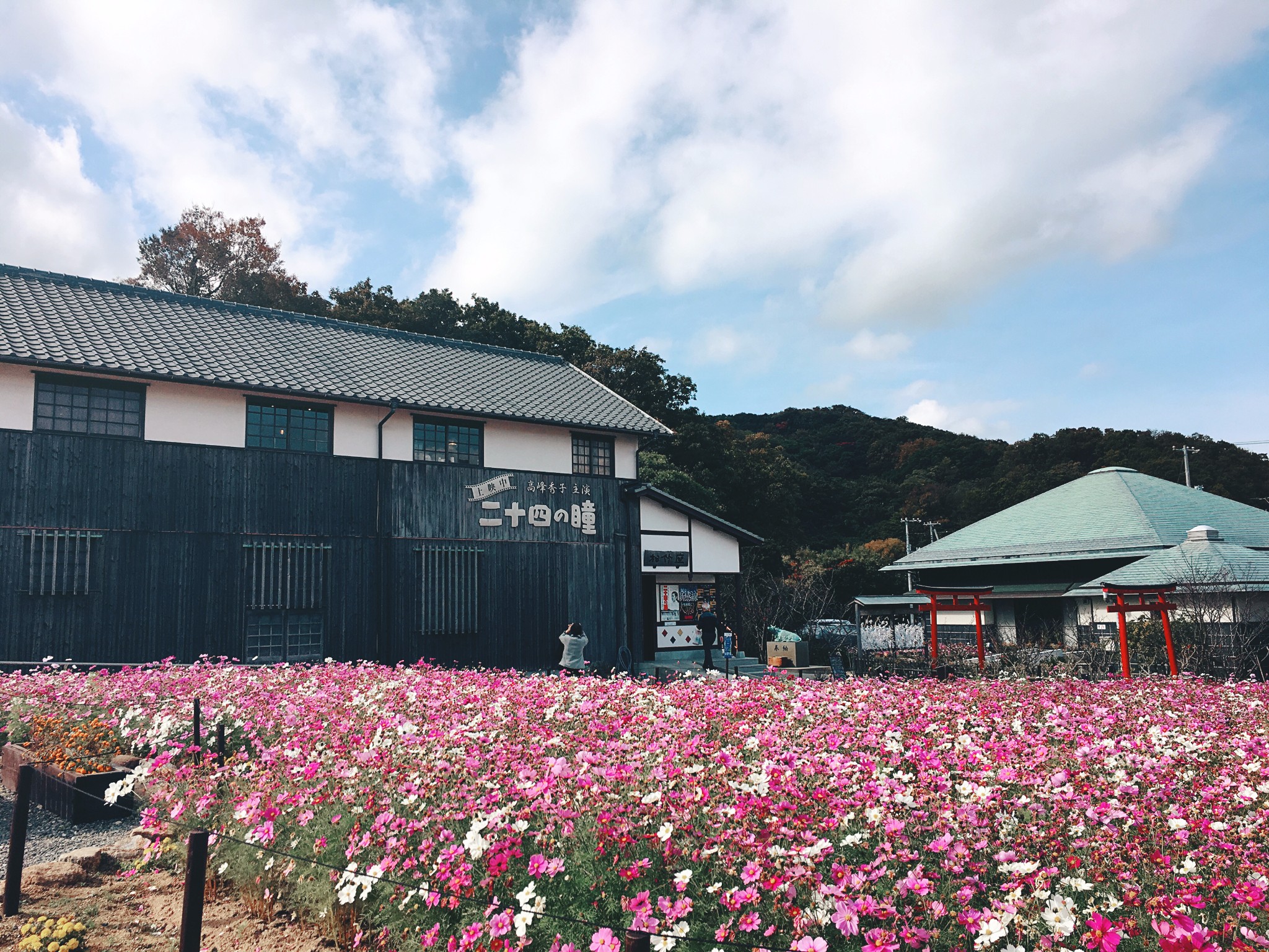 村子保留民居、木制校舍、村中小路,真是重现了昭和初期的景象,犹如走入时光隧道一般。村子里除了木造校舍与渔夫之家以外,还有四季多彩的花田,以及【电影之庵】、壶井荣文学馆等。
