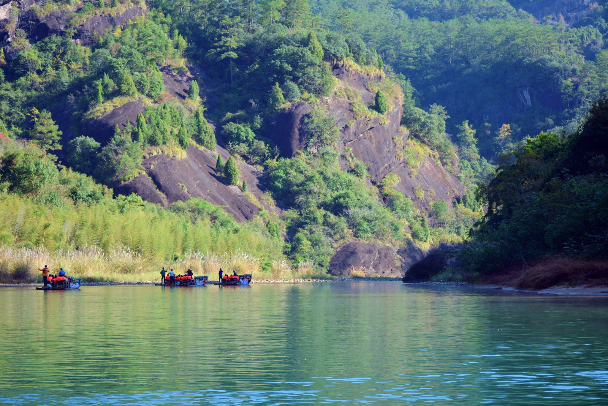 清澈的溪水是武夷山的灵魂,乘坐在古朴竹筏荡入山光水色之中,如融入神话般的境界,令人心旷神怡,两岸的景致慢慢向后移动。波光潋滟,群山井走,有一种“人在画中游”的感觉。