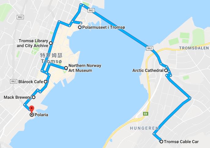 路线:Fjellheisen 缆车——北极大教堂——极地博物馆——特罗姆瑟图书馆——北挪威艺术博物馆——BlårockCafe——迈克酿酒厂——北极星博物馆