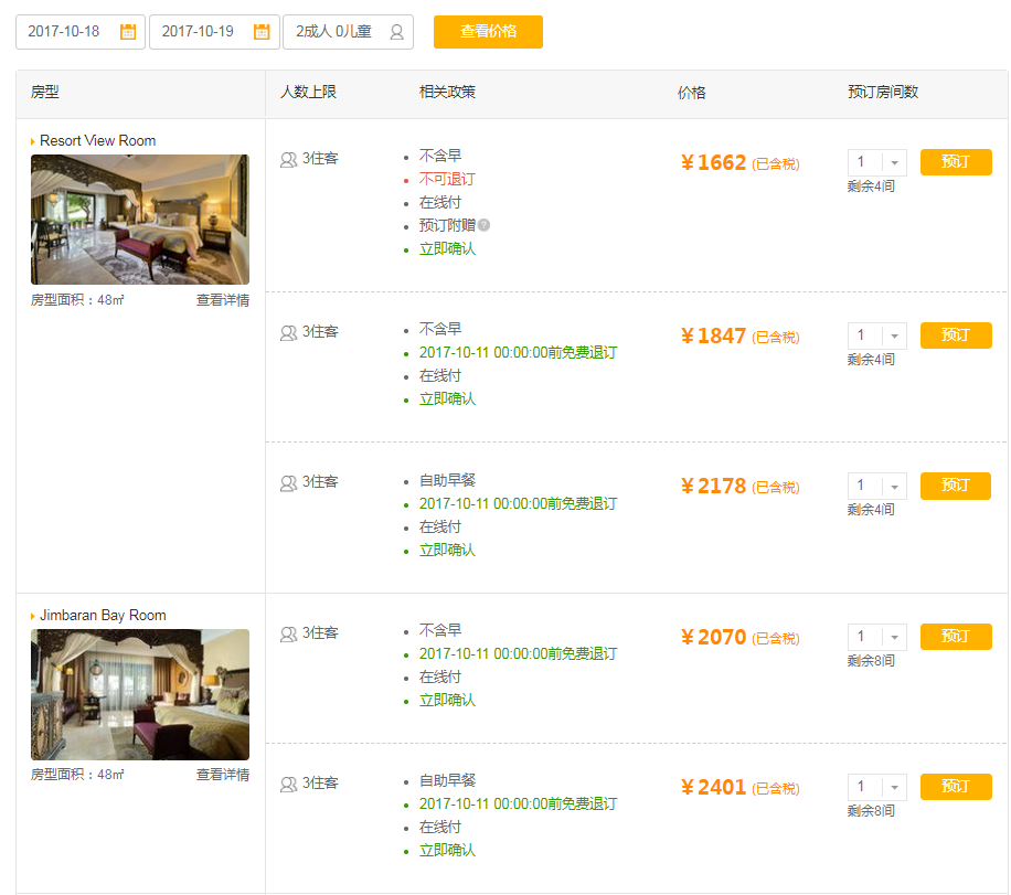 淡季各个酒店为了维持入住率,在价格上都会有更大的优惠,这个时候就是选择入住高端酒店最好的时机。以阿雅娜AYANA Resort and Spa BALI举例。国庆节网上金巴兰房型一晚含早是2981元。