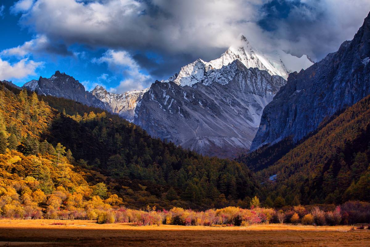 在冲古草甸、亚丁村、冲古寺等地区都可以看到夏诺多吉神山,傍晚在亚丁村可以静静的观赏夏诺多吉的日照金山。