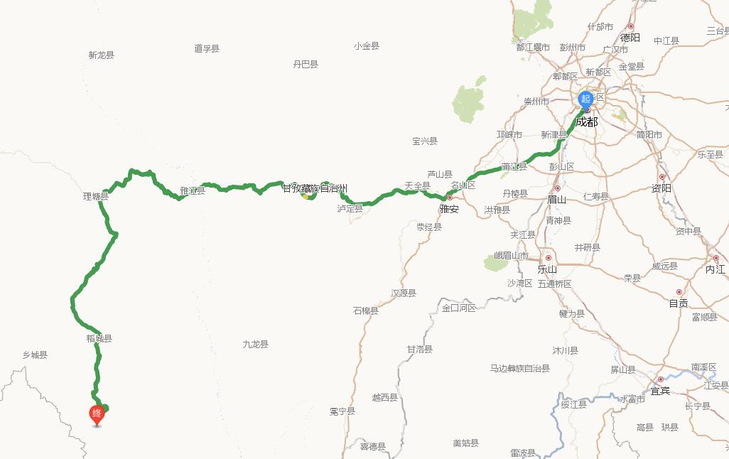 成都出发(318景观大道):成都—康定—新都桥—理塘—稻城县—香格里拉镇(原日瓦乡),约820公里。