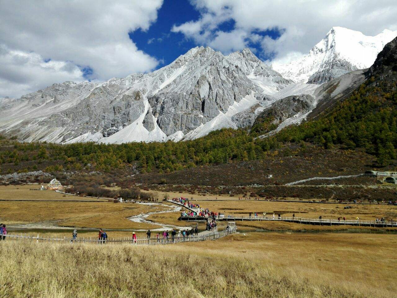 2、从冲古寺到珍珠海1.5KM,徒步来回约1.5小时,珍珠海是看到仙乃日正面的最佳角度。这段路全程都铺了栈道,徒步比较容易。