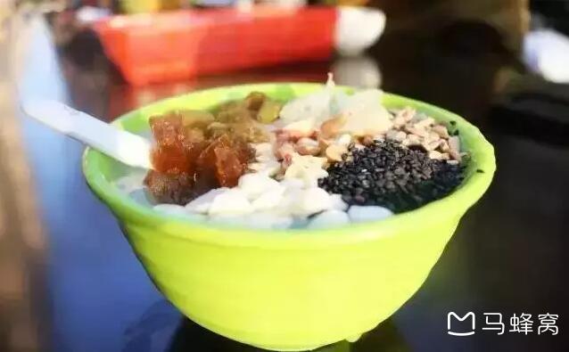 这家有各种甜汤,比如纯藕粉冲出来的杏仁茶加上银耳、芝麻、瓜子仁等六种小料。