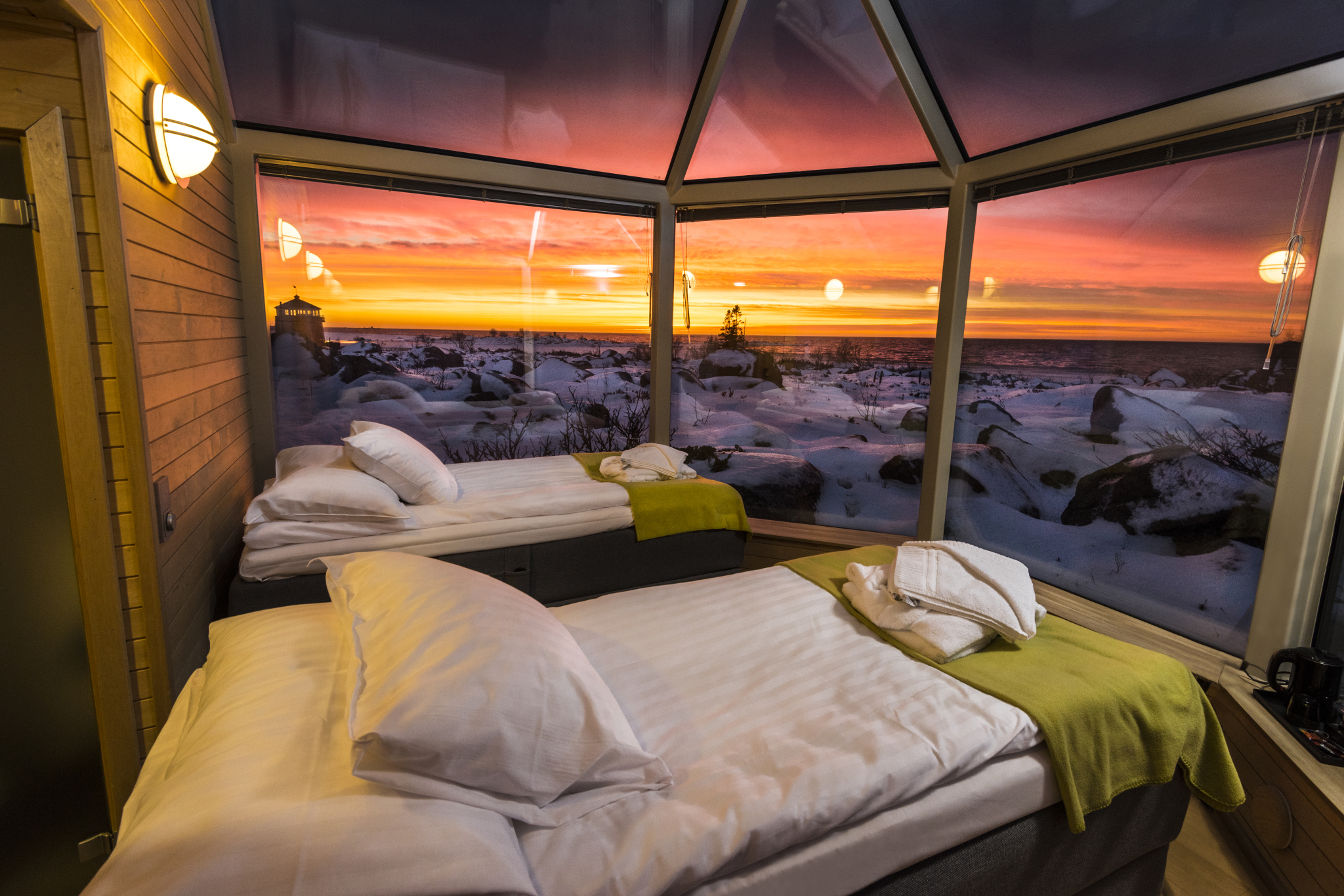 位于港湾的凯米玻璃别墅,也是极光的绝佳视角,算是玻璃屋家族里同时拥有海景和极光的特别成员。极光与海滨雪景相伴,十分唯美,住在这里,可谓是一生难忘的体验了。