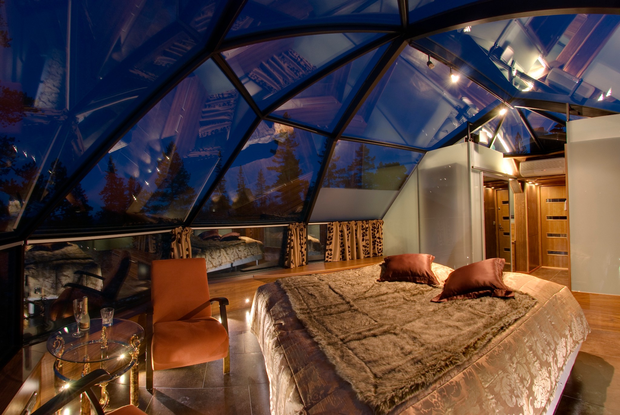 玻璃屋是透明的,但是在里面都可以拉上幕帘(或自动或手动)。在玻璃屋里面坐着或者躺在床上,从外面是看不到人的。