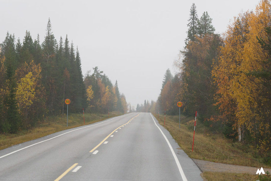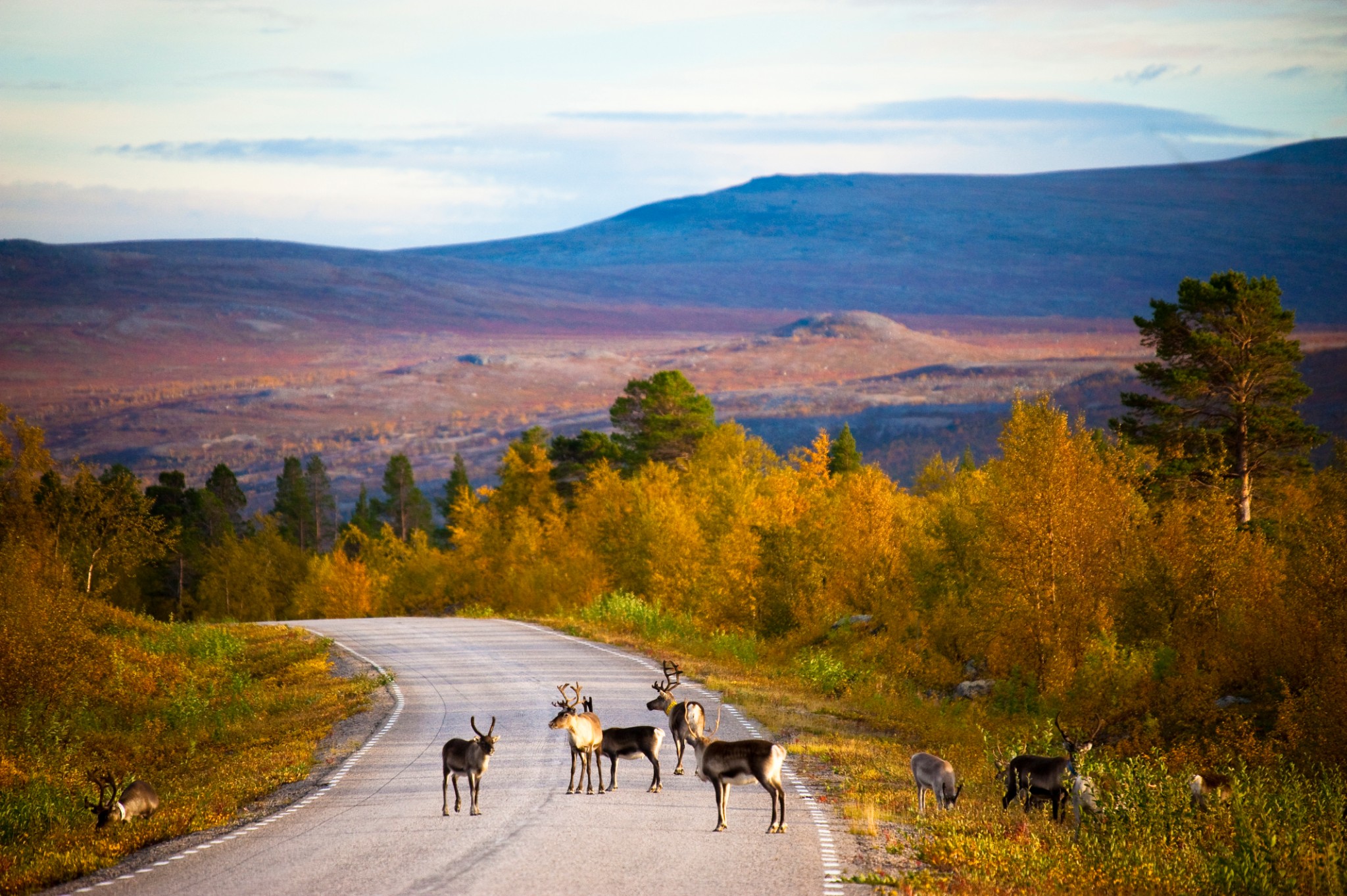 请留意道路上可能出现的动物,特别是驯鹿和麋鹿。驯鹿和麋鹿通常会成群活动,如果在道路上发现动物应该减速行驶或停车。如果撞到动物请致电紧急求助电话112。