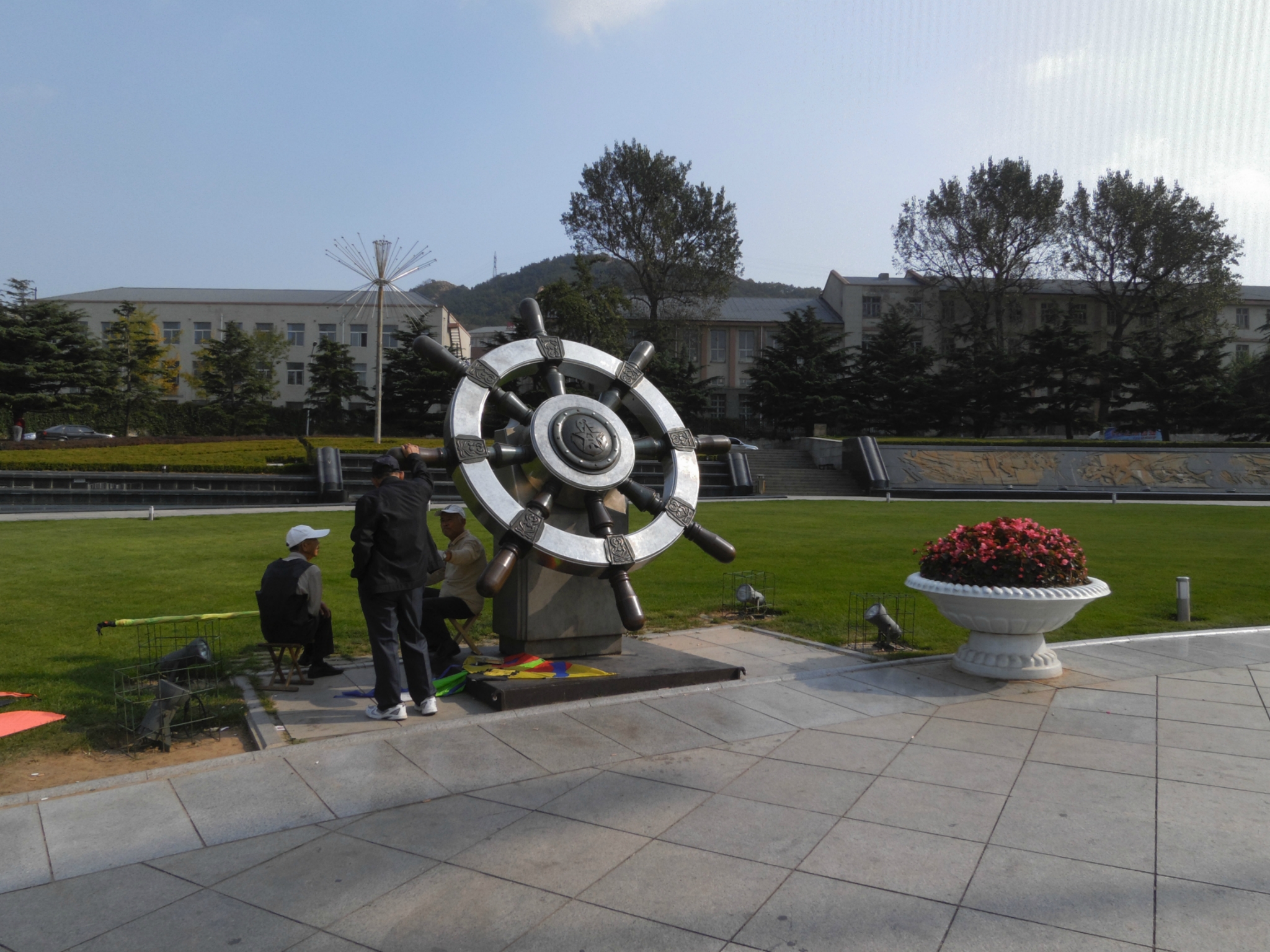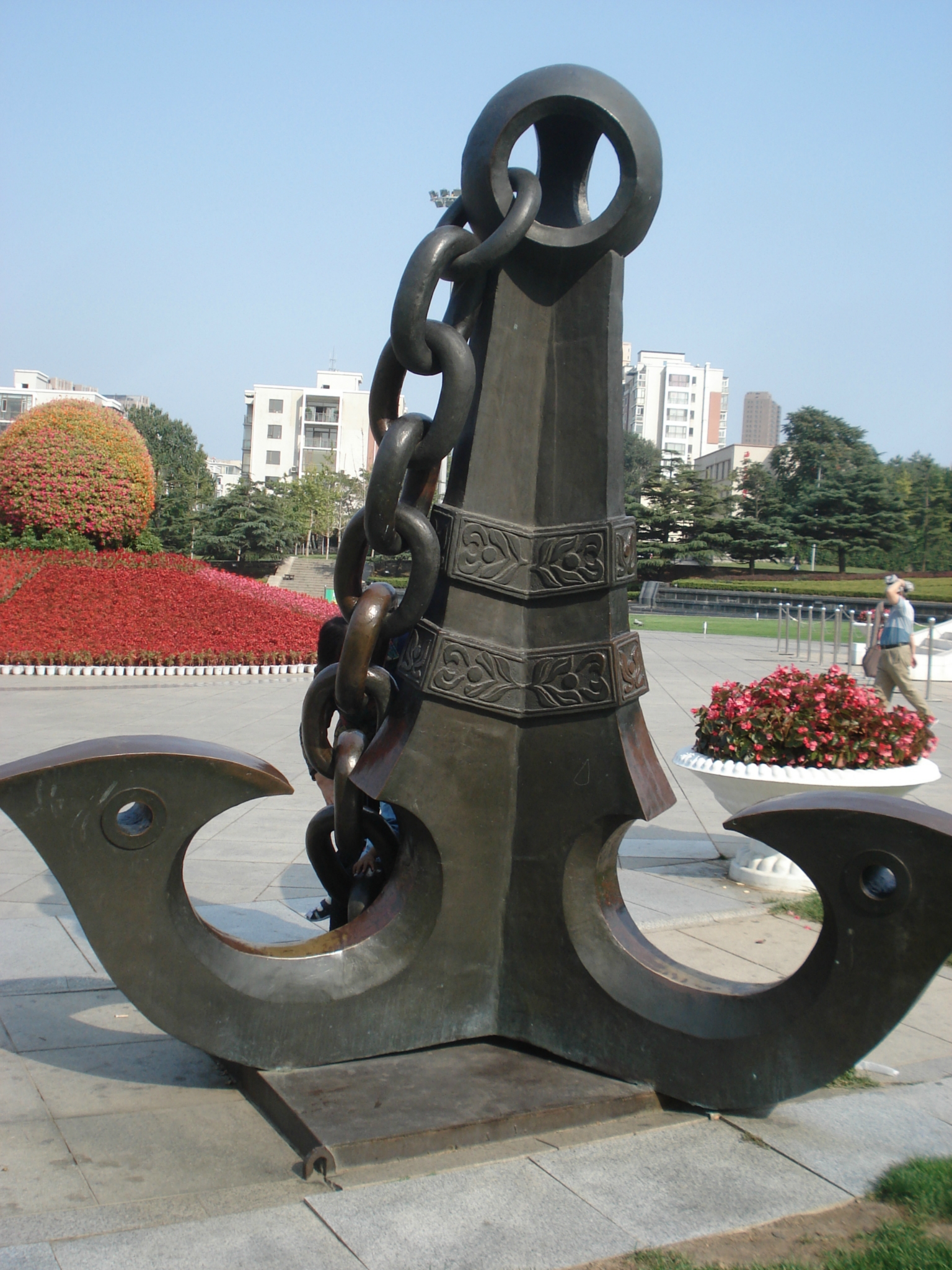 ”广场的四周是音乐喷泉,广场南面是升旗台和大型海军发展历程浮雕。广场的东西两侧各有一个象征海军的青铜雕塑“舵轮”和“铁锚”,去