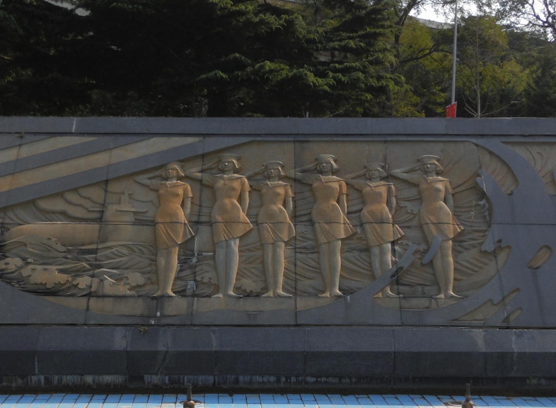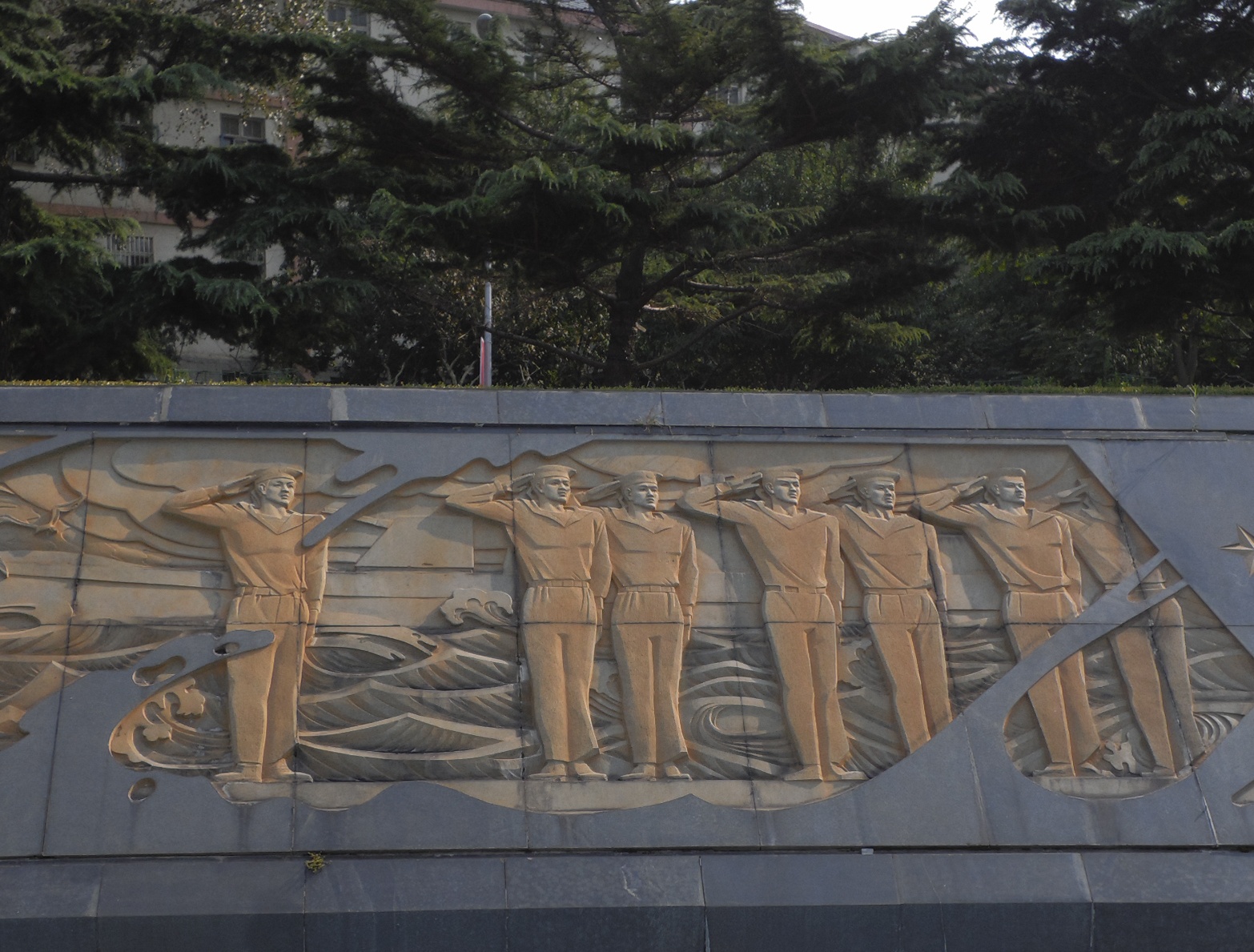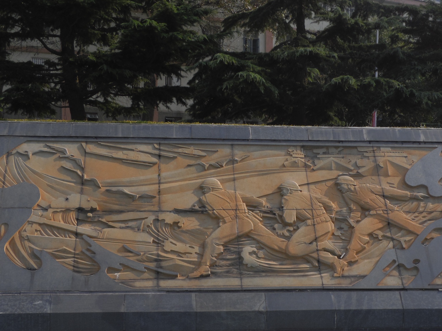 海军浮雕用青花岗岩雕刻而成。全组共有142块小浮雕,中央是海军军徽,两侧分别刻画了潜艇、舰艇、海军航空兵部队编队航行、海军陆战队两栖作战抢滩登陆等场面,反映了我人民海军现代化建设的宏伟历程。整套浮雕表现了
