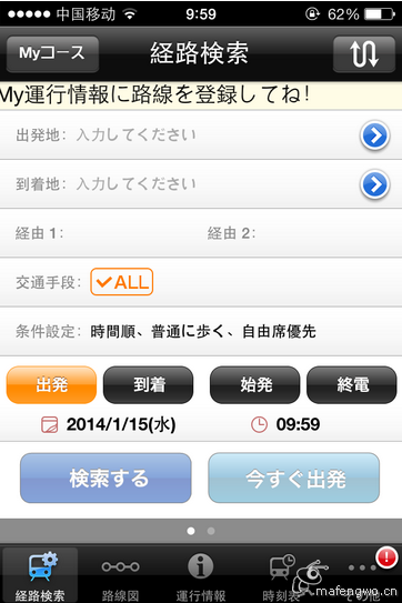出発→出发、到着→到达:在框内输入铁路站台或者巴士站台的名称。