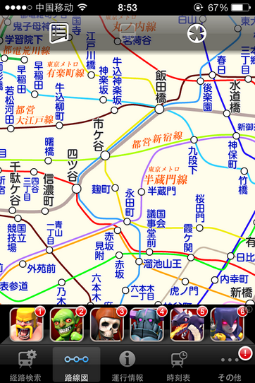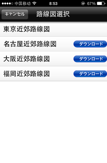 内置东京近郊路线图,名古屋、大阪、福冈的路线图可下载保存到手机上,有蜂蜂反应东京是默认的,其它的看不到,是这样的,你要点击APP下端的第二个【路线图】选项,就看到下面的图啦,然后选择你要下载的城市,点击蓝色的ダンウンード,就可以下载到手机上啦。