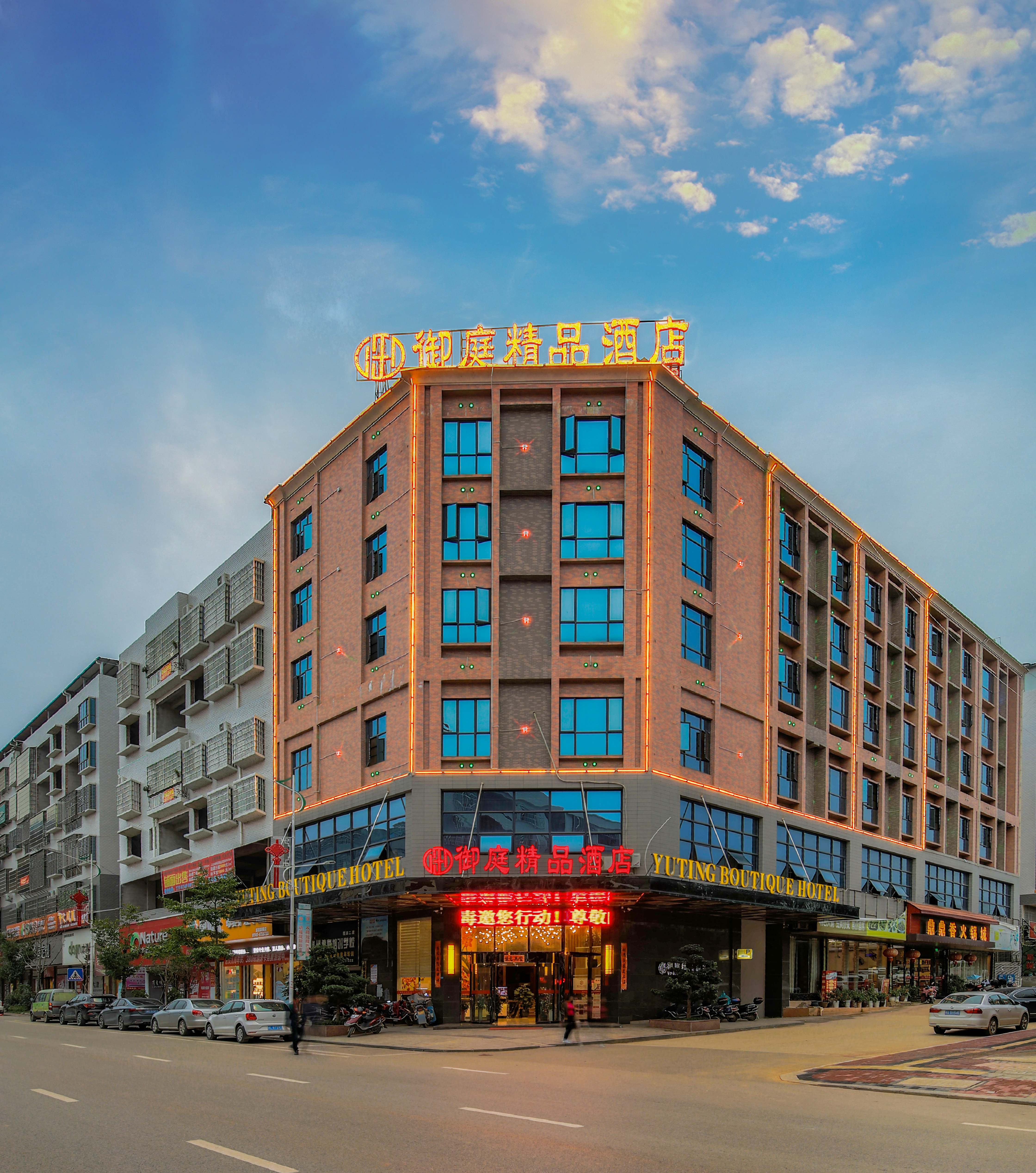 新田御庭精品酒店地处新田县新城区云鹤路,周边商业配套完善,交通便利。御庭精品酒店秉持“精致不粗、高雅不俗、舒适不累”的设计理念,将现代商务融为一体,以高雅温馨却不失简约内敛的设计风格将人文与现代气息完美融和。御庭精品立足打造新田性价比第一酒店,我们提倡“管家式”的周到服务,一切心您的体验为前提,让安全舒适、温馨体贴、专业细致的服务带给您亲人般的享受,家人般的温暖。