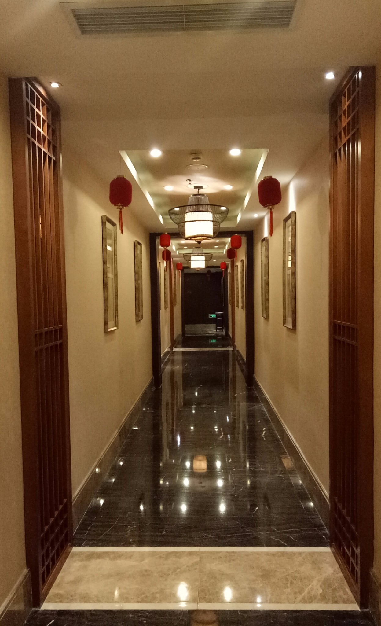青城豪生国际酒店(五星级),免费送温泉泡澡,所以就选它啦。房间的装修还是太朴素,达不到五星级。不过酒店大堂、餐厅以及别的设施还是非常有特色的,处处体现道家的清雅,特别值得称道的是酒店通往青城道温泉的 通道 两侧是“明本五禽戏”、“十二段锦”、“太极拳”的图画招式。冬日泡温泉甚是惬意。还有就是“弥远书屋”布置地非常温馨,可惜没有时间坐坐。