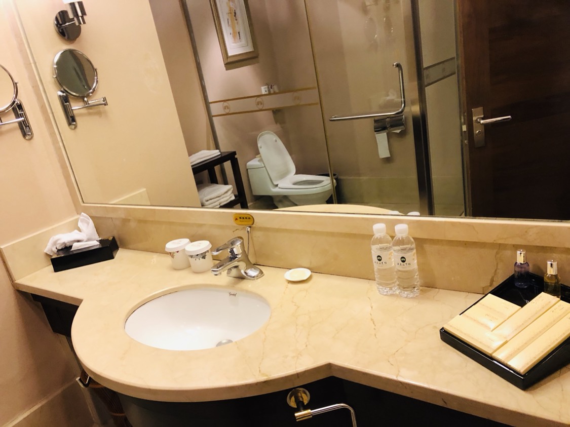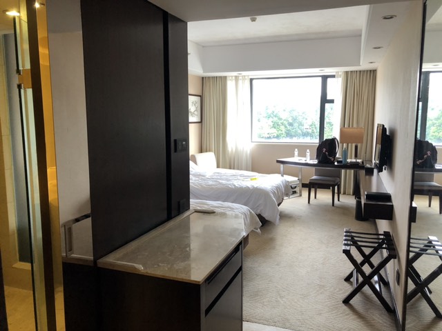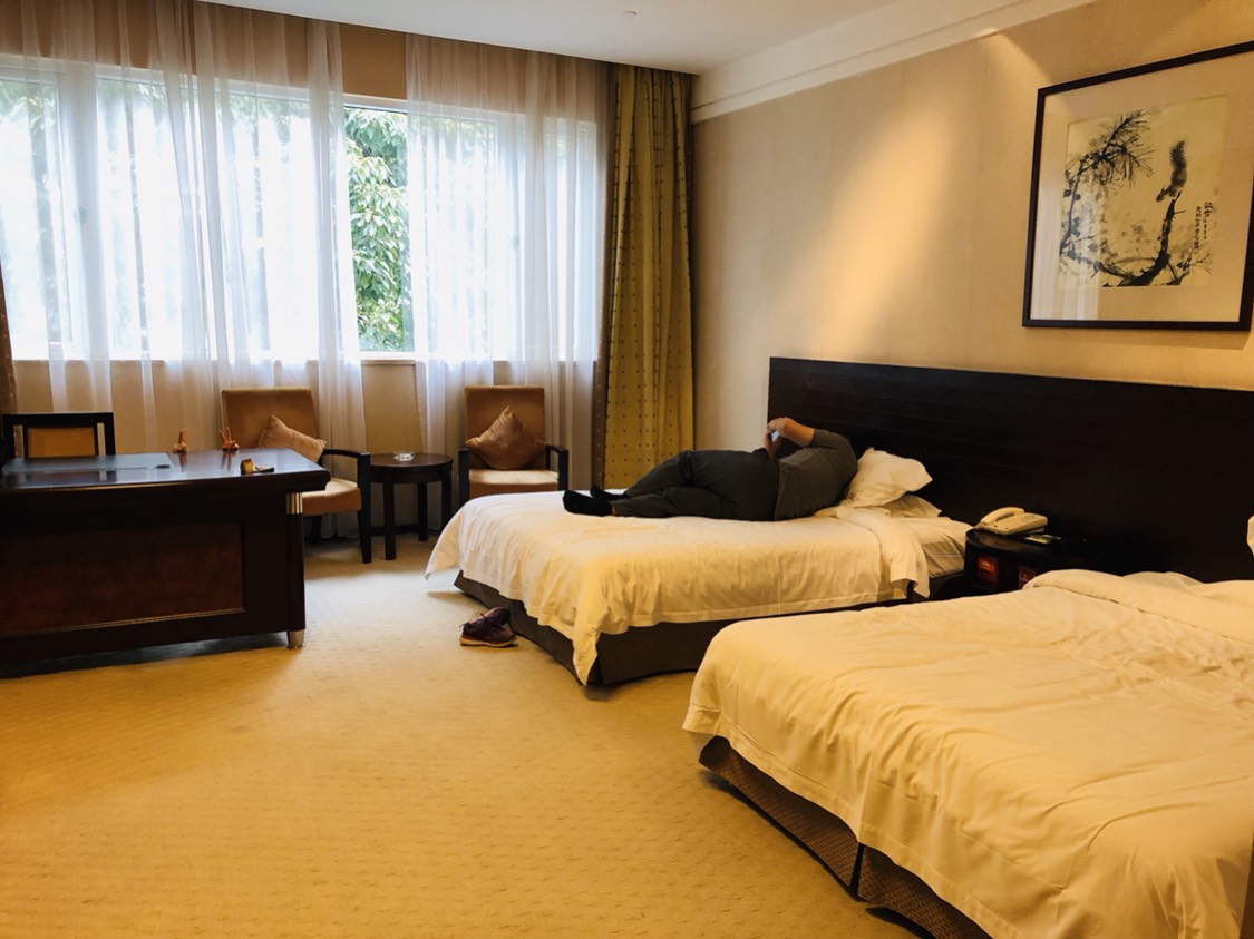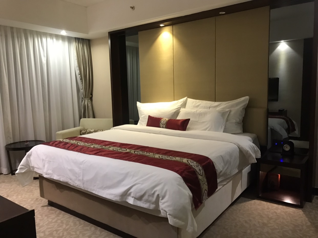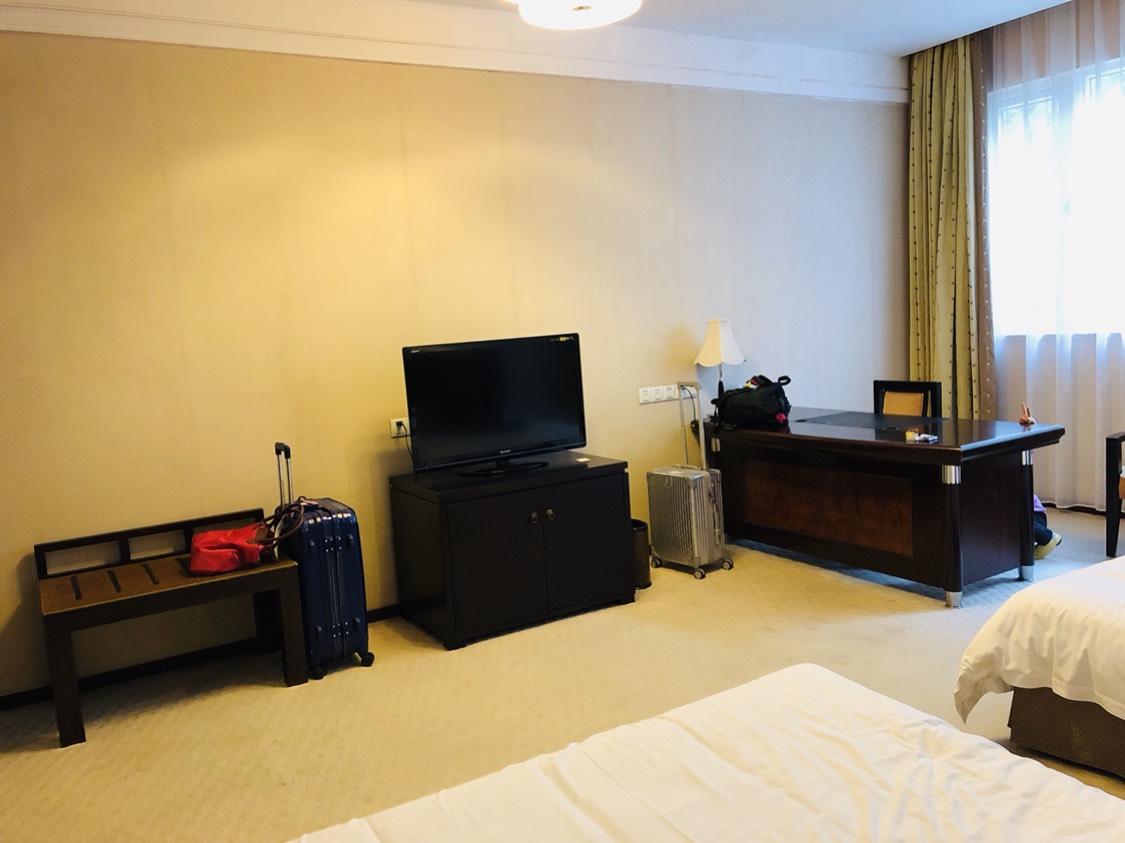 房间: 这次定了标间, 预定时显示房间27平米, 但实际房间超大, 估计得有40平。 房间在碧海楼4层, 但电梯只到3层, 还要上一层楼梯。 房间卫生还可以,但设施比较老旧, 床头没有总控开关, 也没有插座, 很不方便。