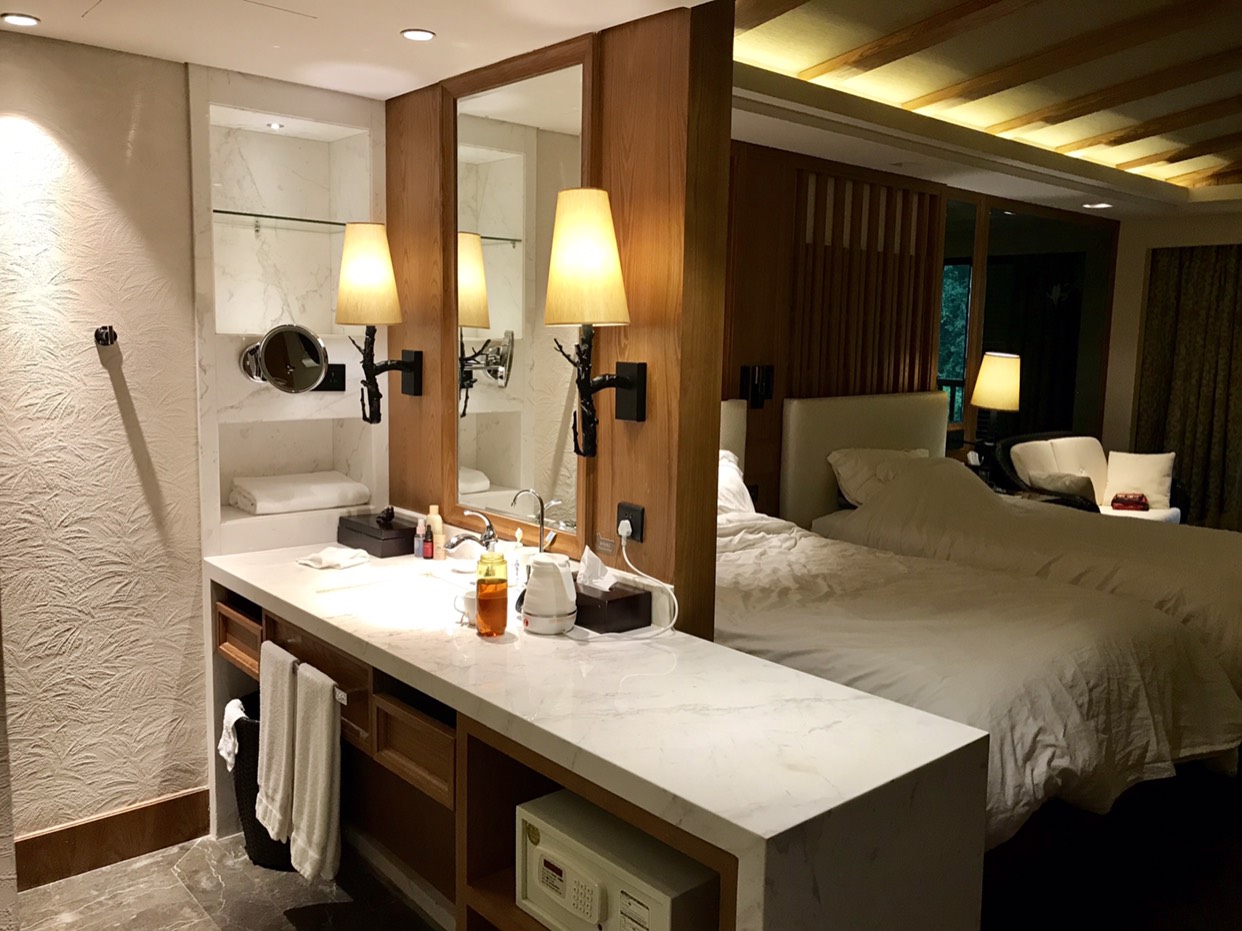 原来预定的标准间,到了之后加了116升级成豪华标准间,有个阳台,阳台下是一条小溪,对面是山,晚上伴着潺潺溪水声和蝉鸣声入睡也是一种特殊的体验!房间干湿分离,特地带上lush的肥皂来个泡泡浴享受下~酒店离南部索道步行15分钟左右,周围有家好吃的饭店~