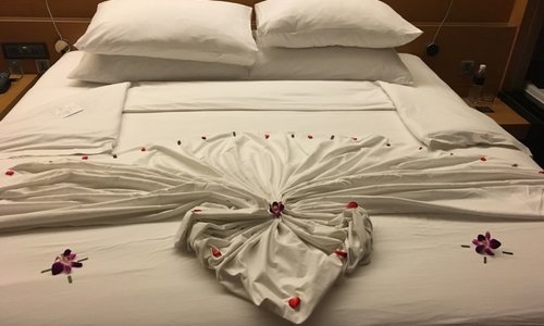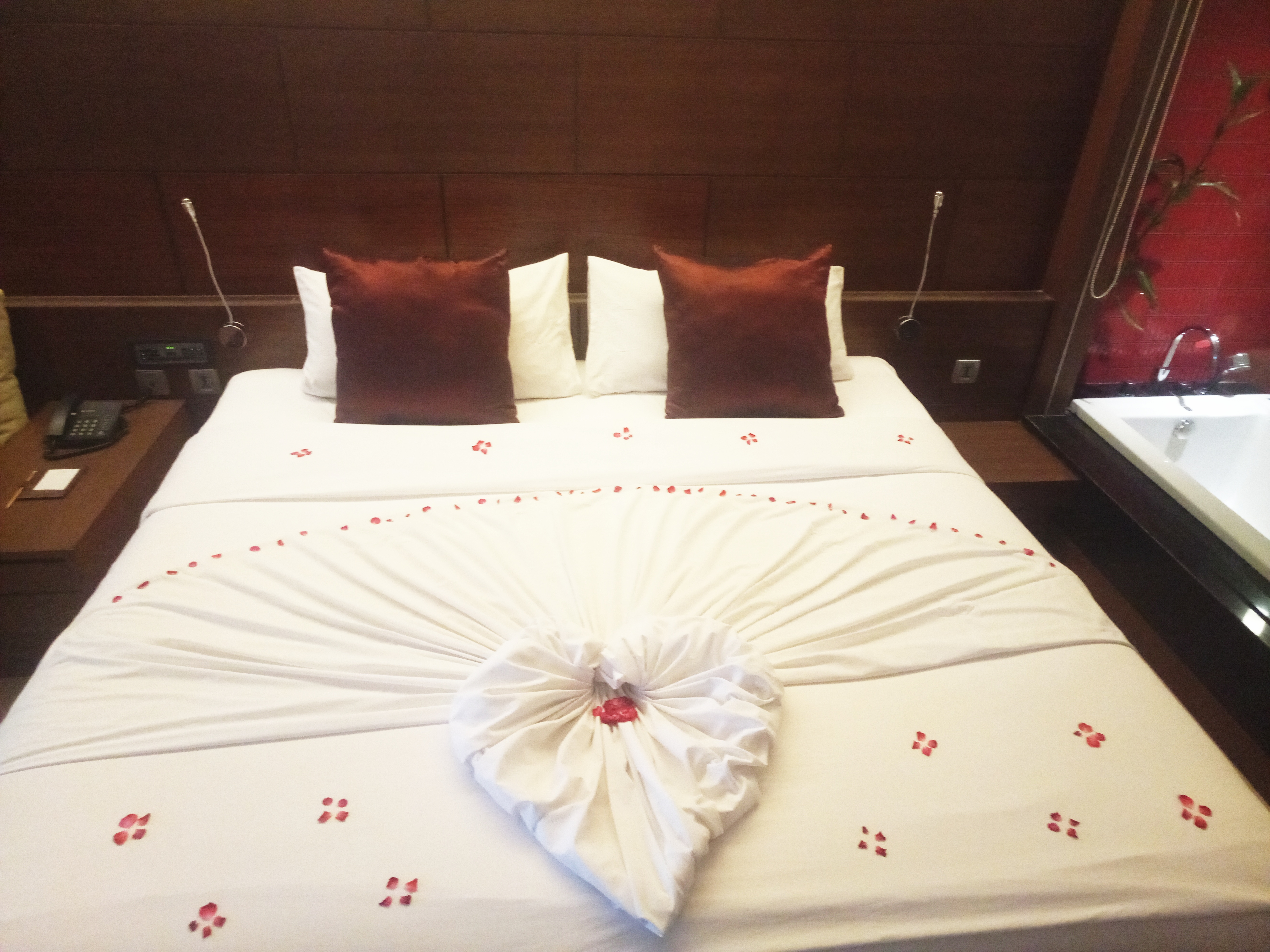定的房型也比较好,位于五层,房间很大,设备彻底,各种细节都做得很棒,婆婆特别喜爱浴室内毛巾折叠的小兔子,房间做了蜜月安置,恰当漂亮