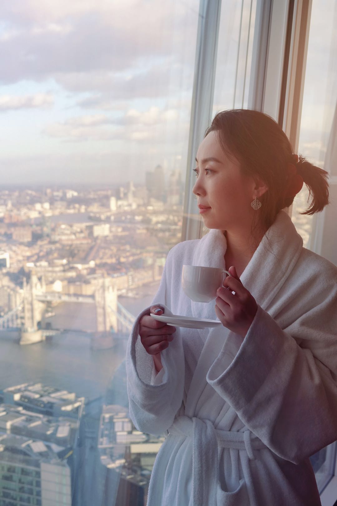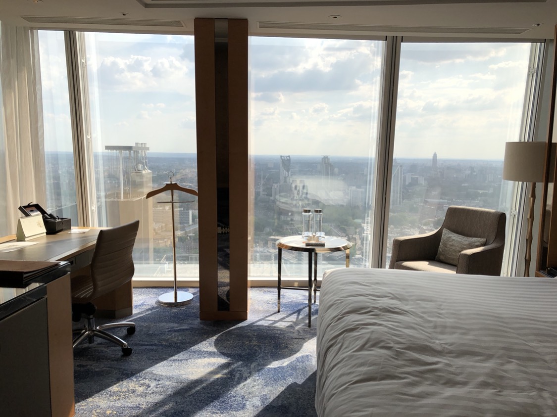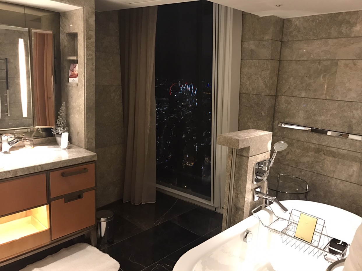 我们这次特意定了Iconic City View Room, 人民币6k+一晚,心疼啊!! 这房型的View真的可以说是躺在床上就可以一览无余游览伦敦了,哈哈。还在房间里拍到了伦敦的日出。第二晚凌晨因为外面风非常大,半夜被风声吵醒了,然后真的感觉这个楼有一点点摇晃,因为顶层确实太高了!房间内还配有望远镜,洗漱用品是欧舒丹的,味道很好闻。