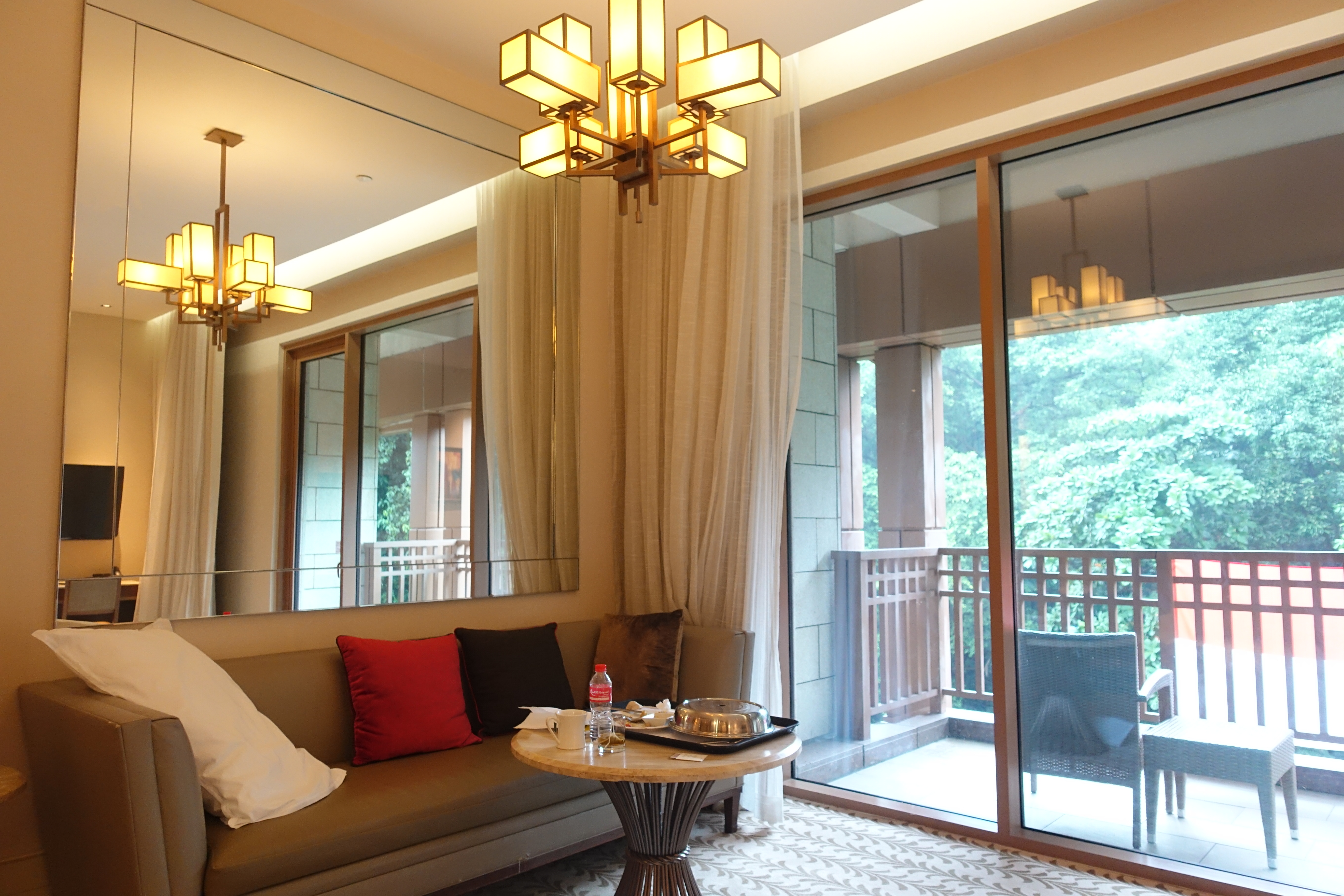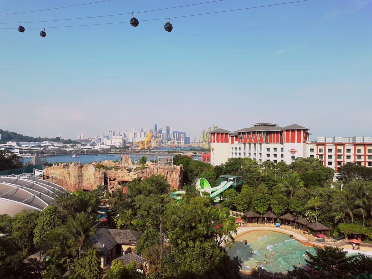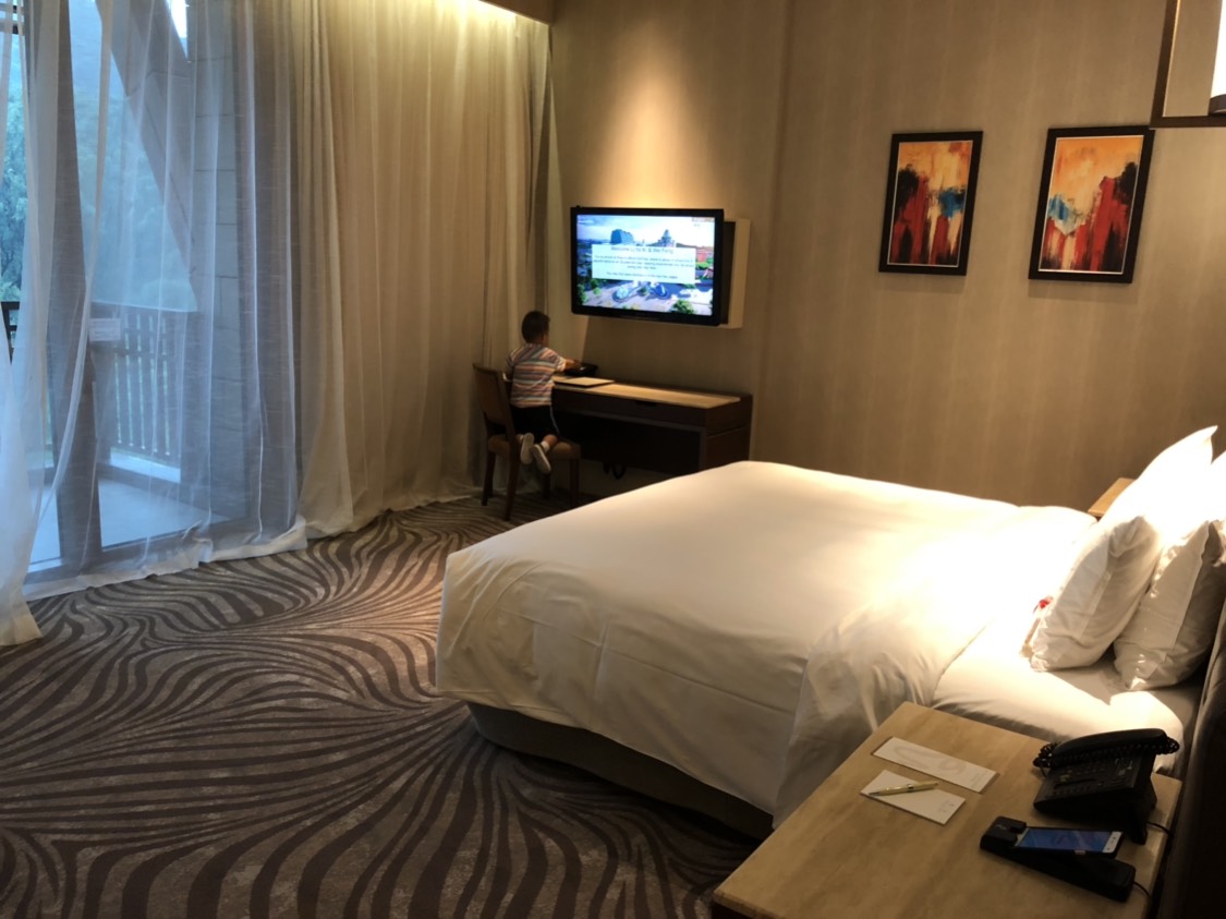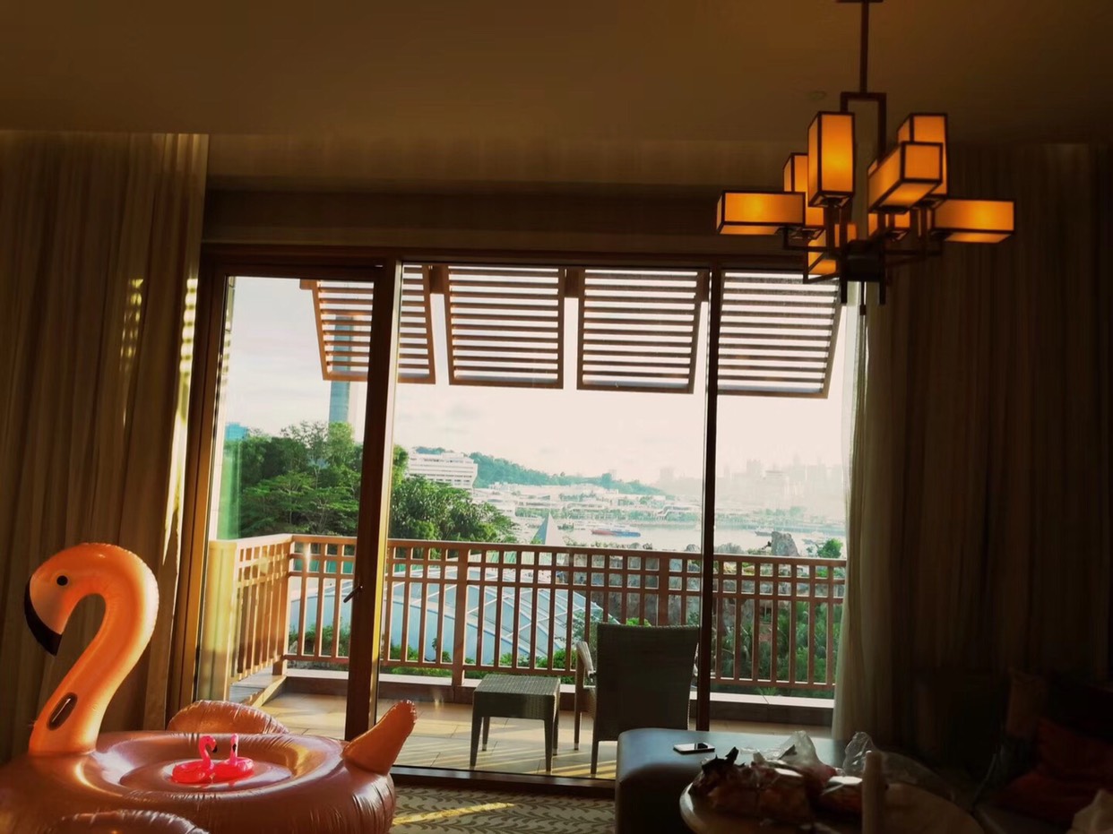 专车直接把你拉到岛上酒店,你要在国内提前打印好酒店的入住单,坐车上岛之前也许会查验,岛上住客免费上岛,否则还要花钱上岛。坐小火车进出岛办理入住时酒店会给三张卡,这样进出岛乘坐的小火车都是免费的了。入住时给了一间8楼最里面的房间,进房后一看果然房间够大,差不多50平米,卫生间够大,洗漱用品齐全含男士刮胡刀,吹风机功率大很好用,有浴缸可以泡澡(懒得刷的可以带一次性浴缸套),有四瓶免费矿泉水,咖啡茶叶包齐全,茶叶包用了新加坡名品TWG的茶叶,不喝也可以收起来每天都给,攒点回来给喜欢喝茶的人也行。阳台对面能看到进出岛的高空缆车,屋里有沙发,床足够大,感觉床还不够大的话睡沙发都行。总体感觉酒店房间还是挺好的,符合我们想象的标准。
