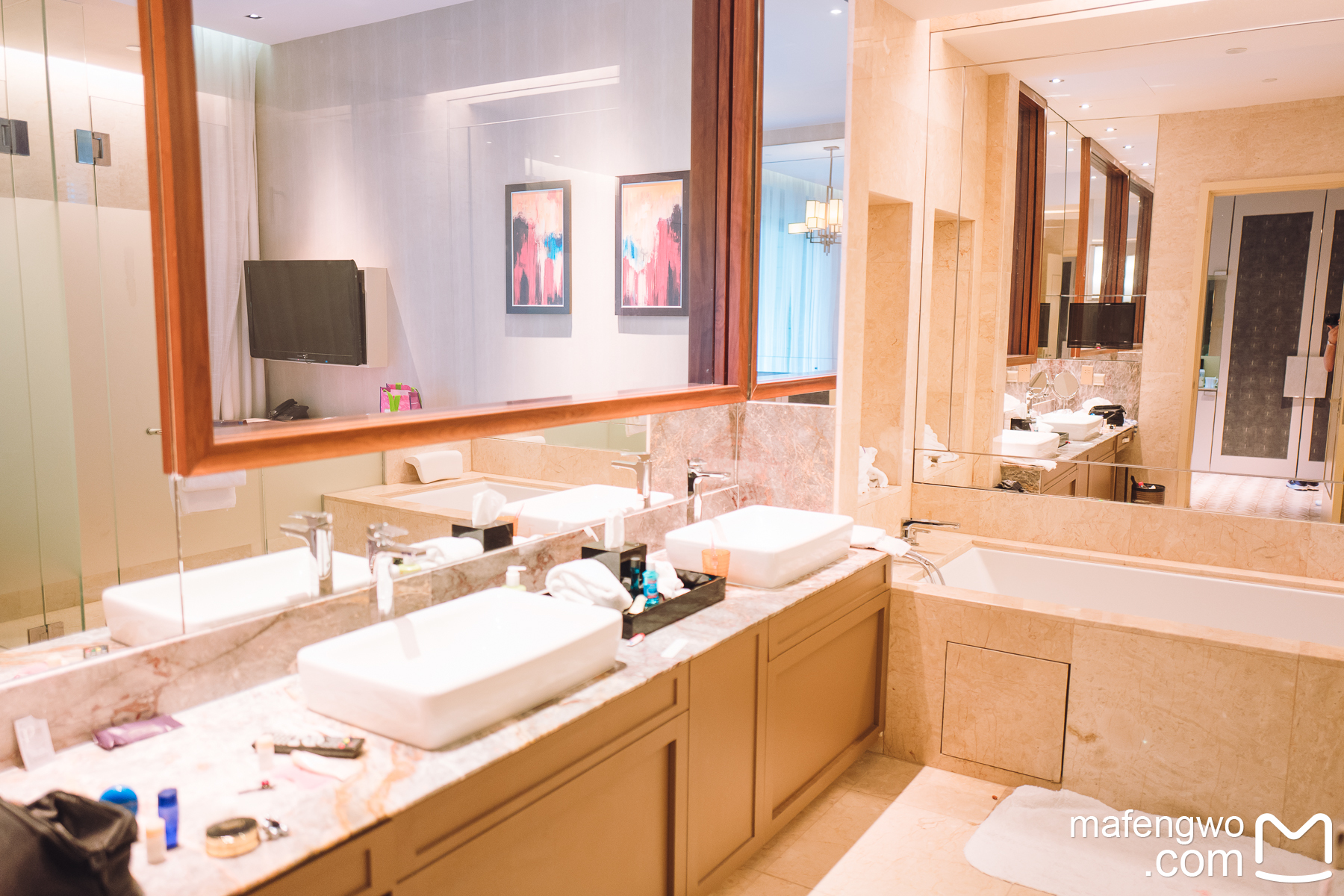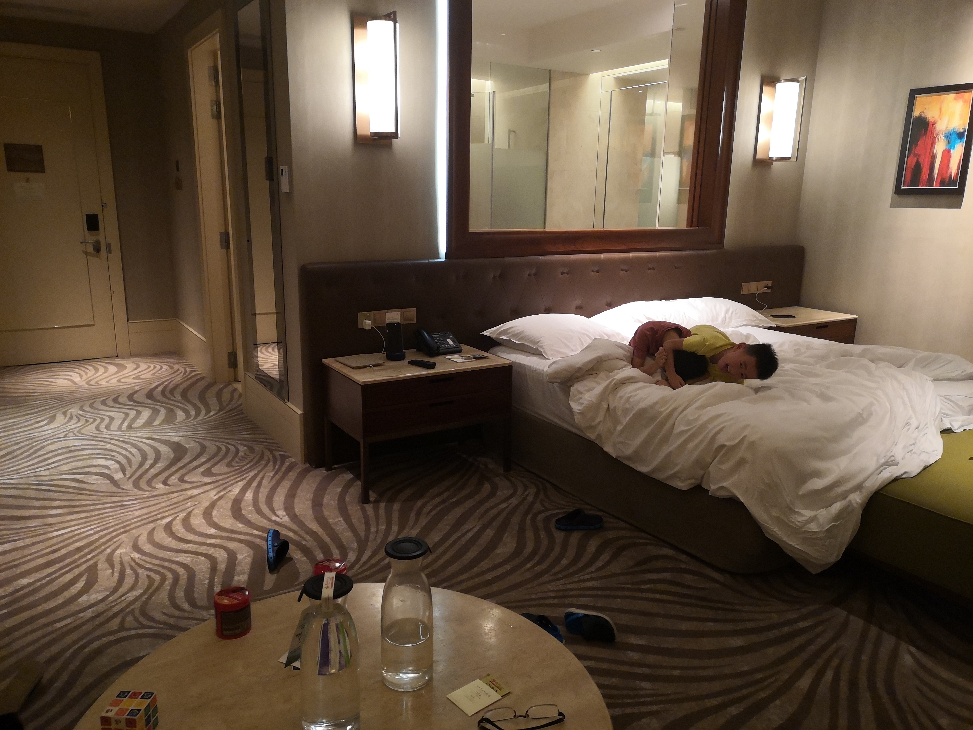 酒店房间,卫生间真的挺大,比金沙酒店的房间大,去水上探险乐园超级方便,酒店可以买乐园票,酒店工作人员会从酒店后门带你进入乐园。酒店办理入住效率比较低,退房很快。从酒店到名胜世界有免费巴士,15分钟一班,酒店周边没有吃的,半夜如果肚子饿了要去名胜世界还是要靠步行,步行大概10几分钟吧,所以论方便肯定是住名胜世界的酒店更方便