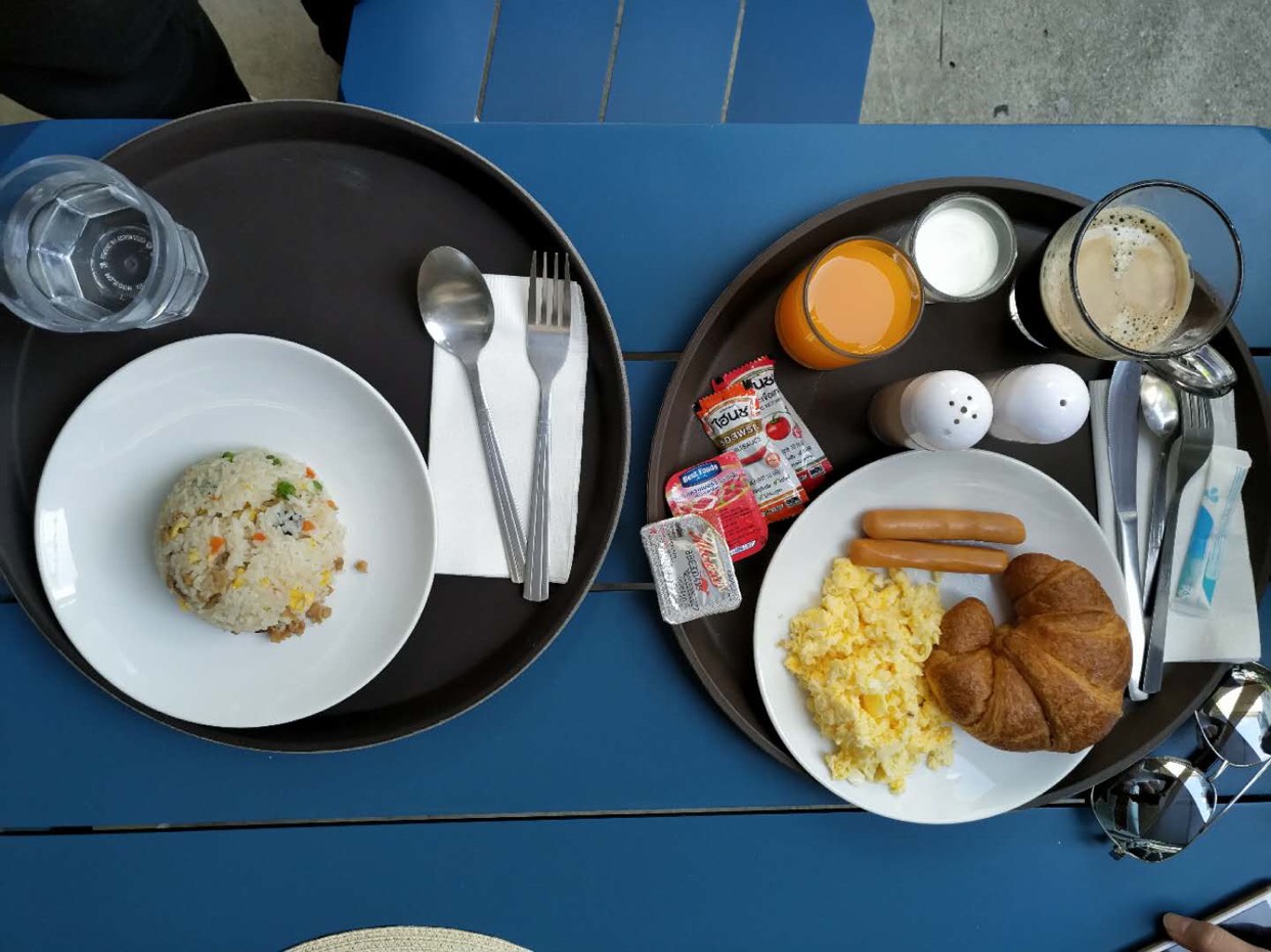 酒店就在轻轨下面,附近就是商业中心,招牌不太好认,朋友开车送我们过去,一不小心就错过了,曼谷又堵车,绕了一大圈才回到。住这里的大多都是背包客,世界各地都有,客厅很大,房间很紧凑,不提供一次性的东西也没有拖鞋,地板很干净,入住退房都很快捷,前台旁边就是卖早餐的,欧陆式早餐很简单。