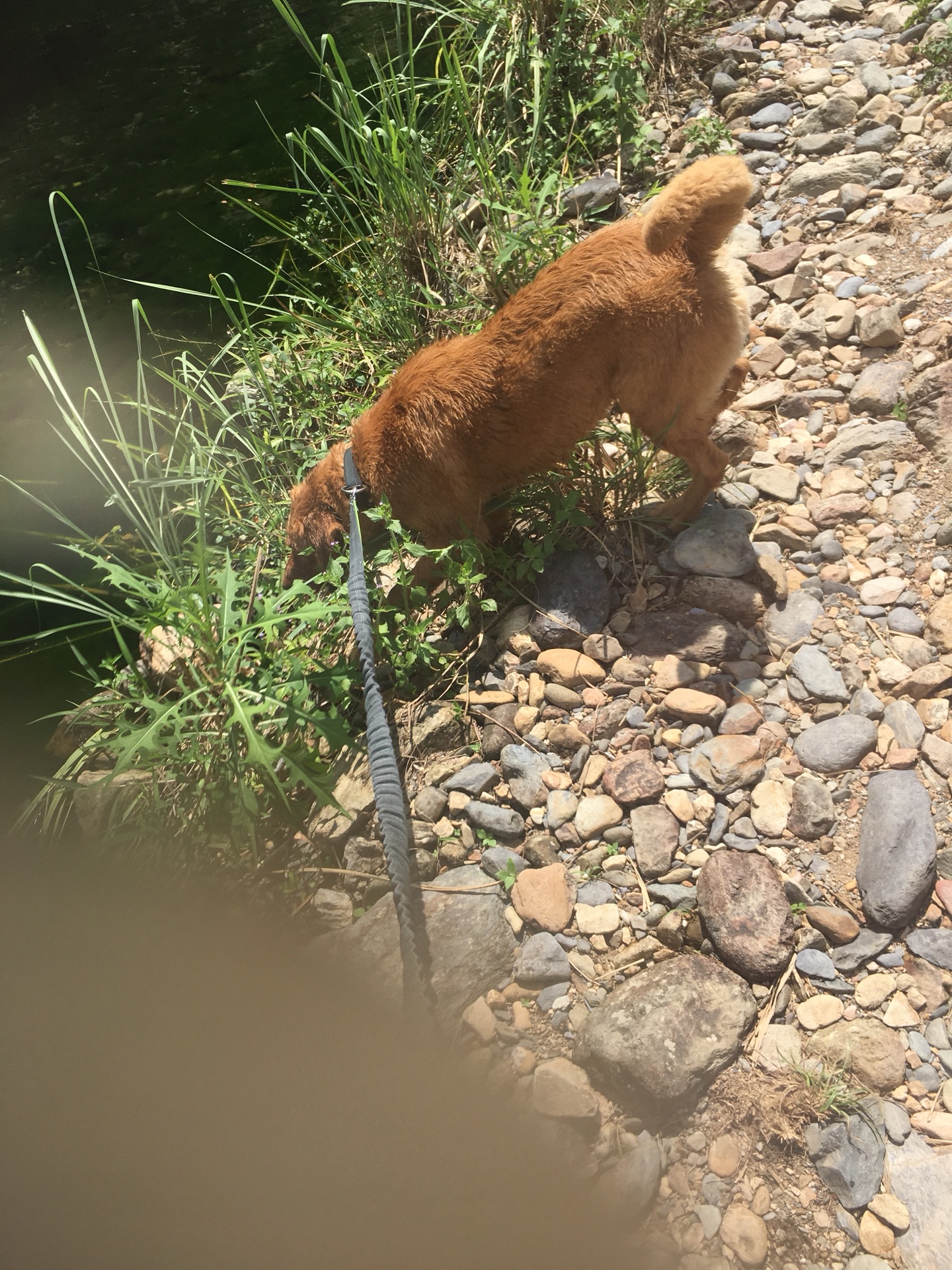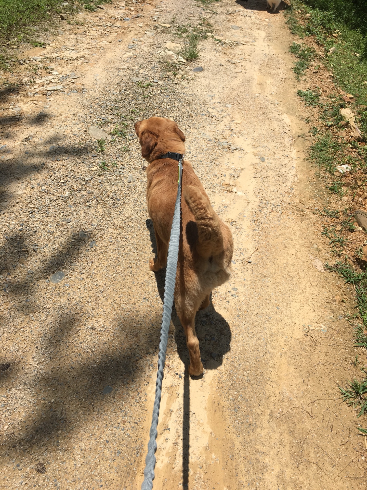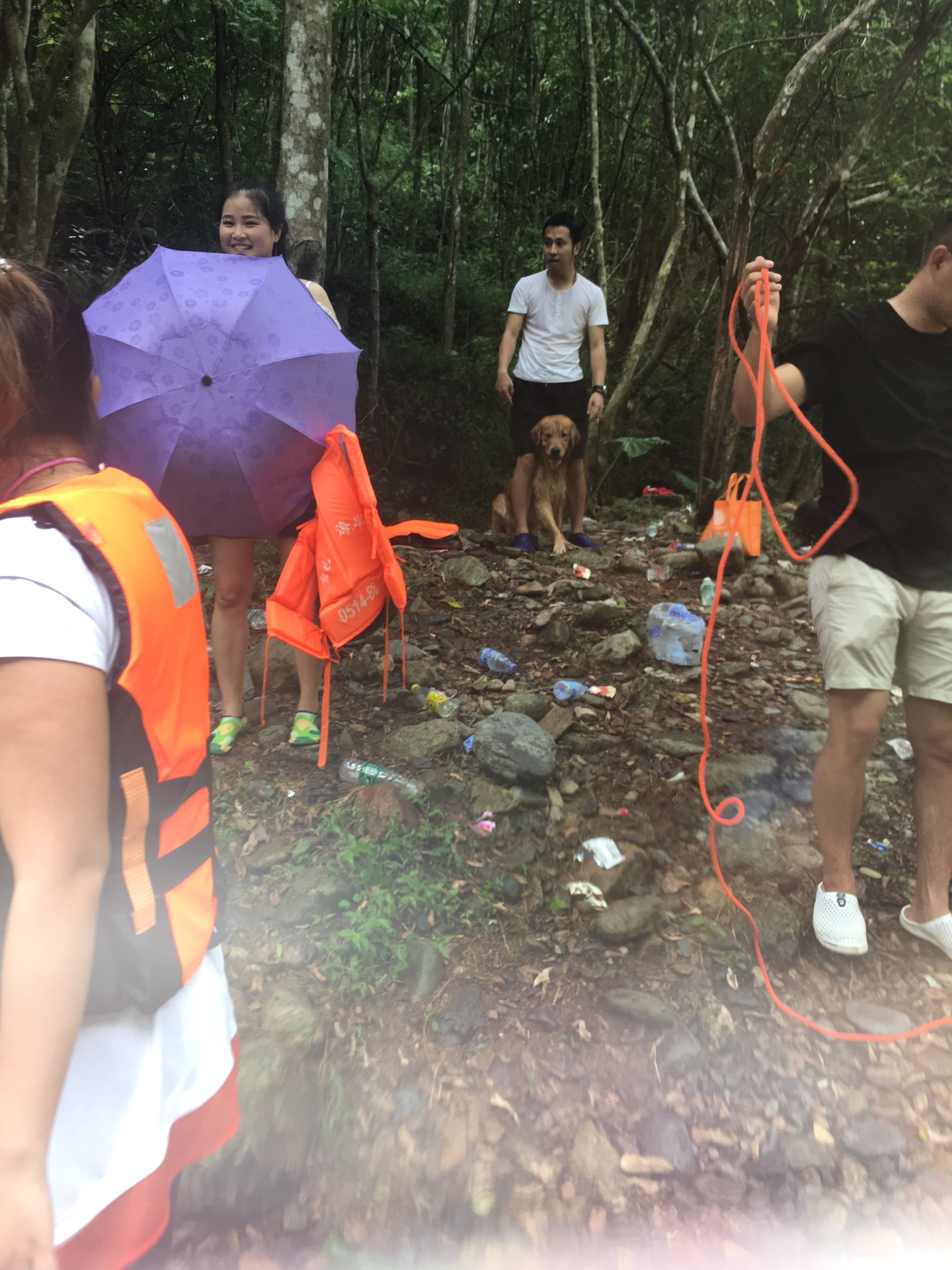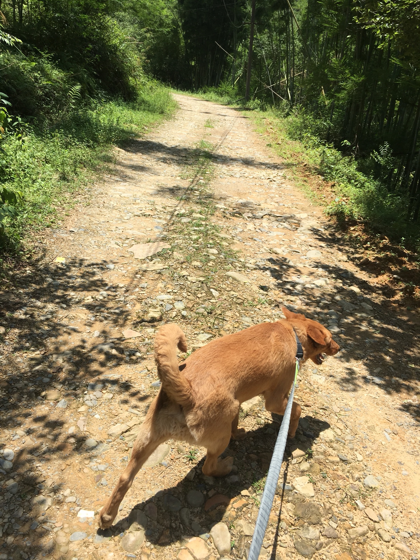下了驳船去往溪潭的路上,忙着防晒,忙着遮阳,忙着适应脚下硌脚的鹅卵石小路,忙着牵大小两只狗主子……