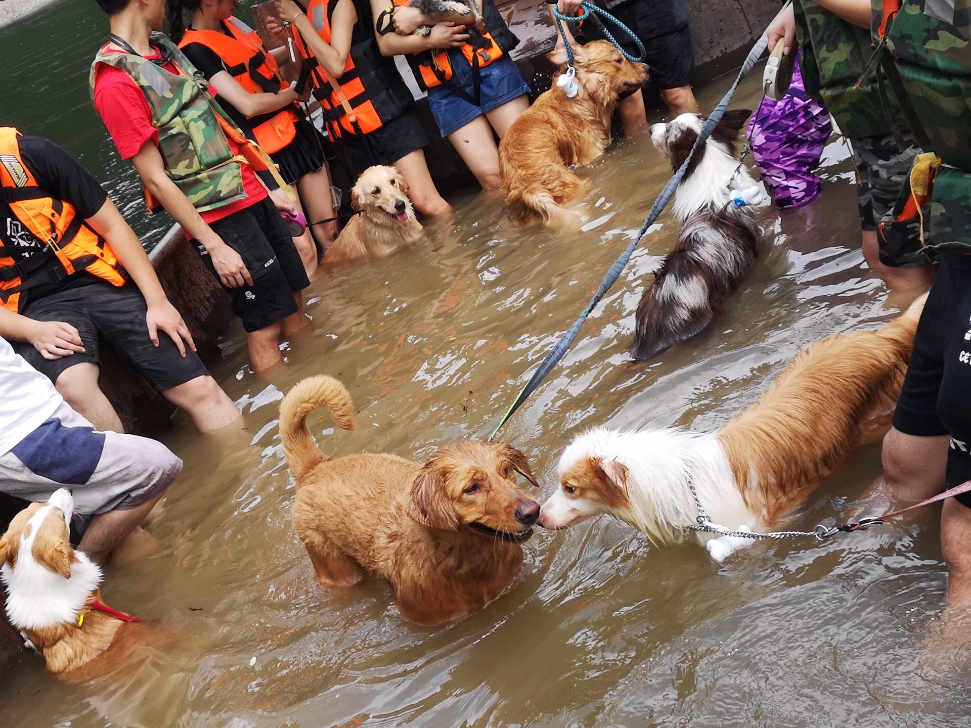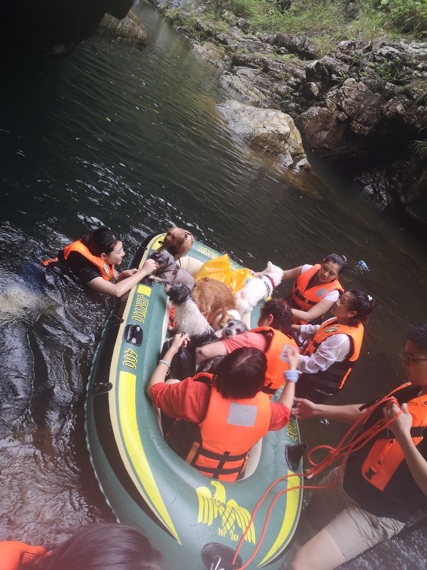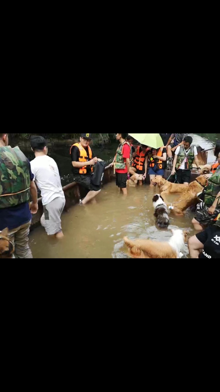 此刻,只有将C主子安置在不会再继续前进的橡皮艇上,好在有其他几只小型犬和两个不会游泳的阿姨在船上待着不进去了!