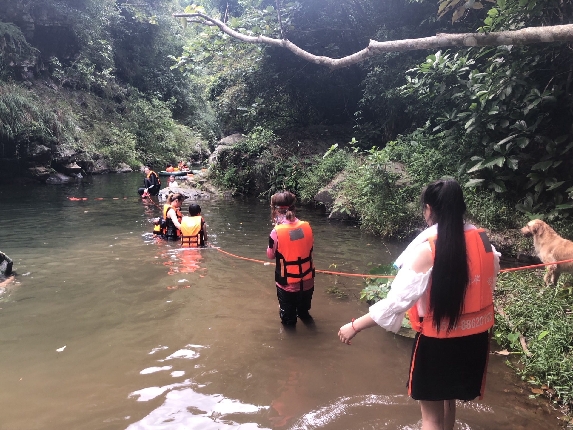一边控制着帅的牵引绳不给他逃窜上岸的机会,一边捞住保命的绳索,总算熬到了溪流的中间段,呼呼