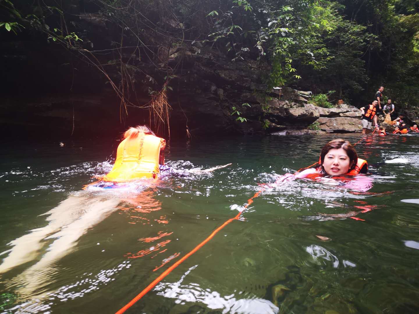 不会游泳的怂货们,拉着向导的绳子慢慢往前行走(其中有我