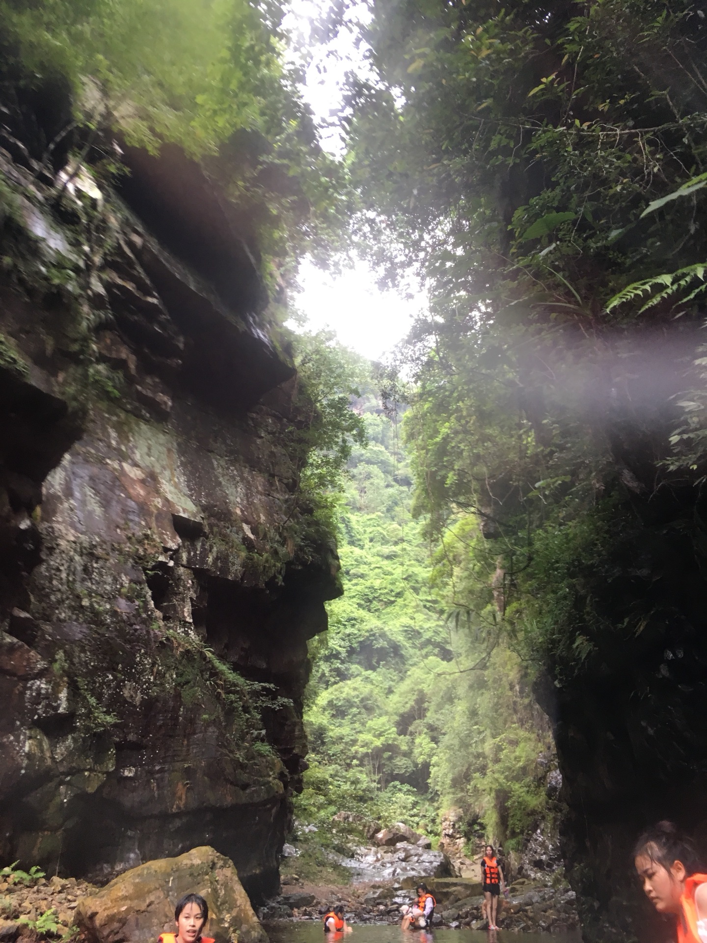 ,看着两遍壁立高耸的峭壁,还有此刻略显阴郁的水潭,妈呀,胆怯的我,只能咬牙跟着小伙伴们啦。