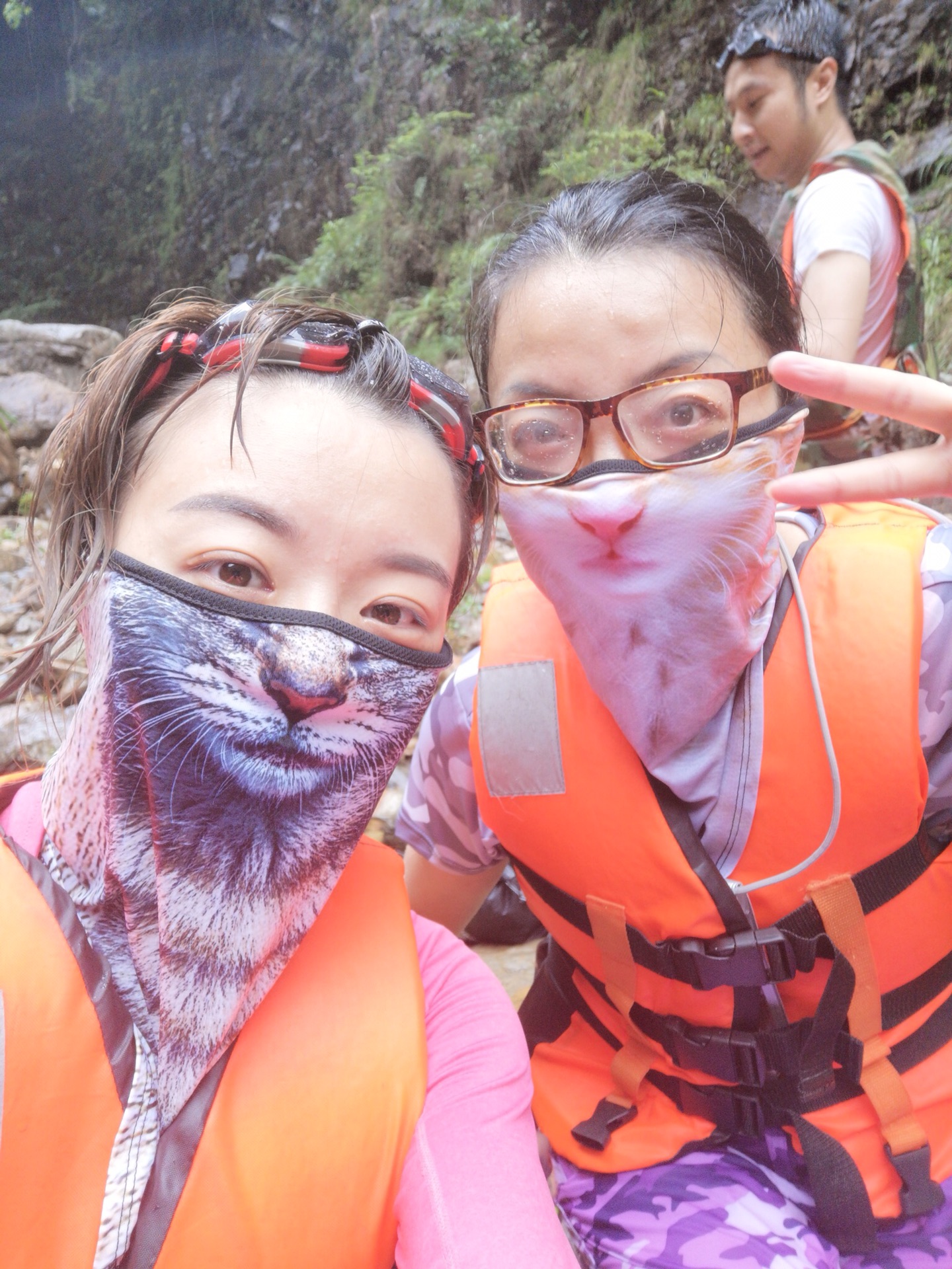 C主子更是佛系的随波逐流,只要从包包里被水流的力量推着漂出来,立马就抱着我的胳膊不撒手,原本就恐惧感满满的我,一边要拉着帅不给他上岸,一边要注意拉着向导的绳子保命,另一边还要保证CC不要被水流冲走。