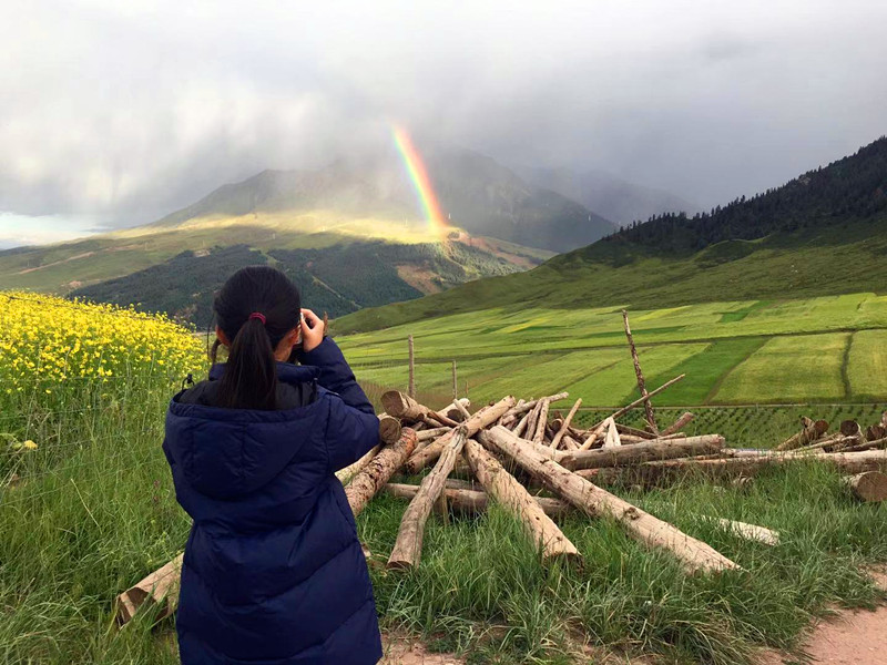 刚到冰沟村的下午,我们迫不及待地开着越野车上山看日落。上山的路没有改变,惊喜的是在青稞地旁发现了不少的大野兔。昔日拍照看日落的山顶种满了油菜花,下山时又遇到了雨雾中的彩虹。