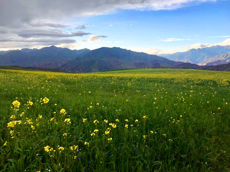 离开祁连返程的那个早上,我们再次驱车上山。由于连日阴雨天,山上云雾缭绕,连绵的山峰覆盖着皑皑白雪,在绿色的青稞和黄色的油菜花映衬下层次分明,美得像仙境。