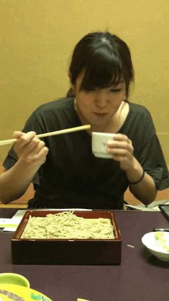 压轴出场的荞麦面,吃法也很讲究:先根据个人喜好,在撞着酱汁的杯中中倒入适量的葱花,然后夹取荞麦面蘸着吃,吃完后往杯中倒入高汤,便成了一碗解腻的清汤了。