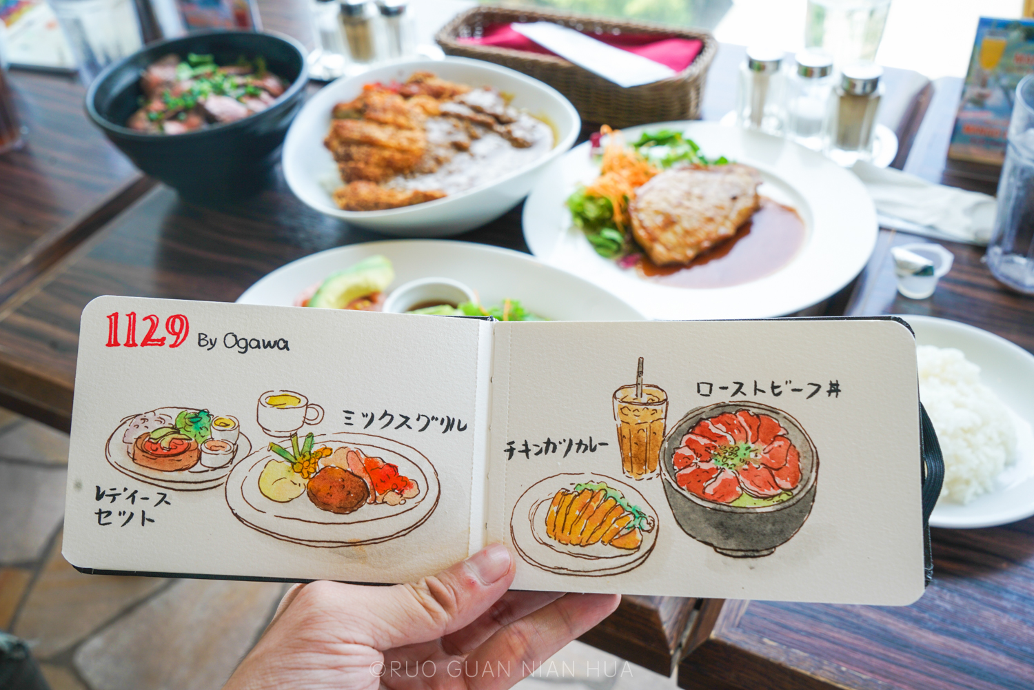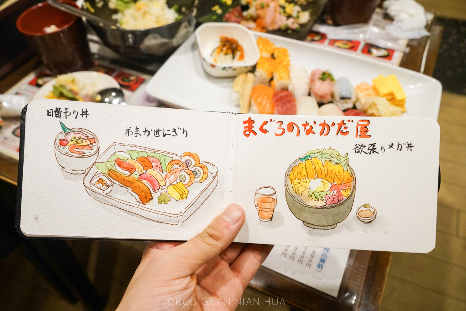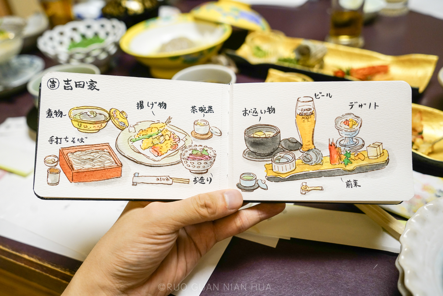 虽主打荞麦面,但提供的餐食可比想象的丰富多了。它家提供多种价位的会席料理选择,我们这次选了会席膳(雪膳),5000日元(约300元),提供了7道菜品,个人觉得性价比还是很高的。不过既然选择了会席料理,那你就要忍耐它的上菜速度,不过正好给我手绘提供了充足的时间。每隔十几分钟一道菜,菜上完了我也画完了。