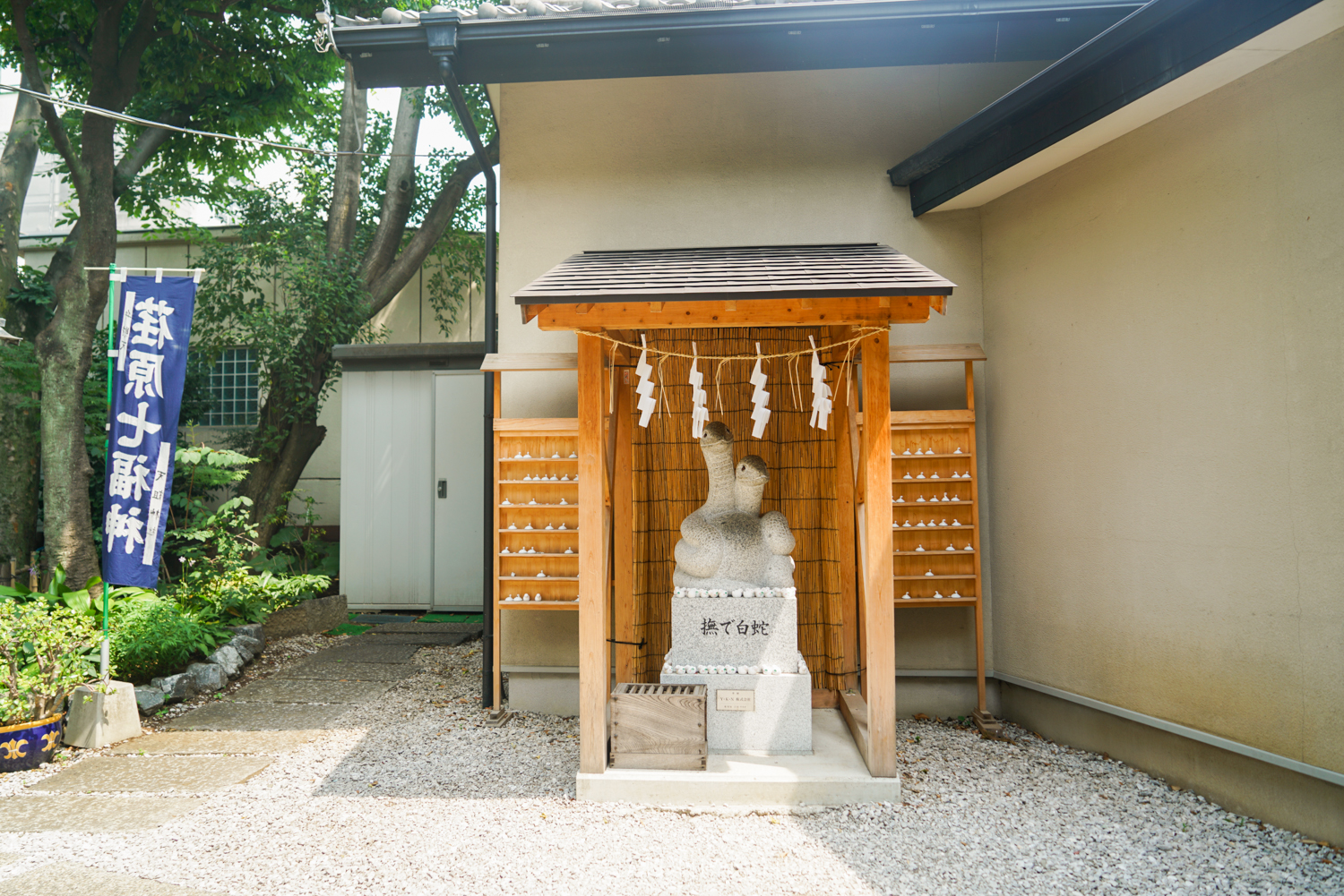 上神明天祖神社里有供奉着稻荷神、白蛇和弁财天等神明的神社。该白蛇的雕像左边为母蛇右边为公蛇,据说抚摸蛇身和蛇头后,夫妻之间感情会更加和谐。