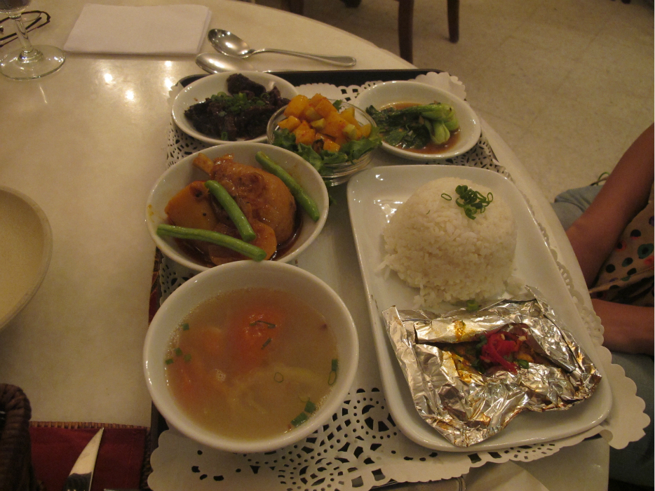 俺点的有点类似快餐的小马来餐,几样小菜,典型的中式风味和马来风味混搭,那个用锡纸包的着烤鱼不错,其它的就一般了。哗!俺被晒得黑黑的小爪子居然也上镜了,,55——掩面