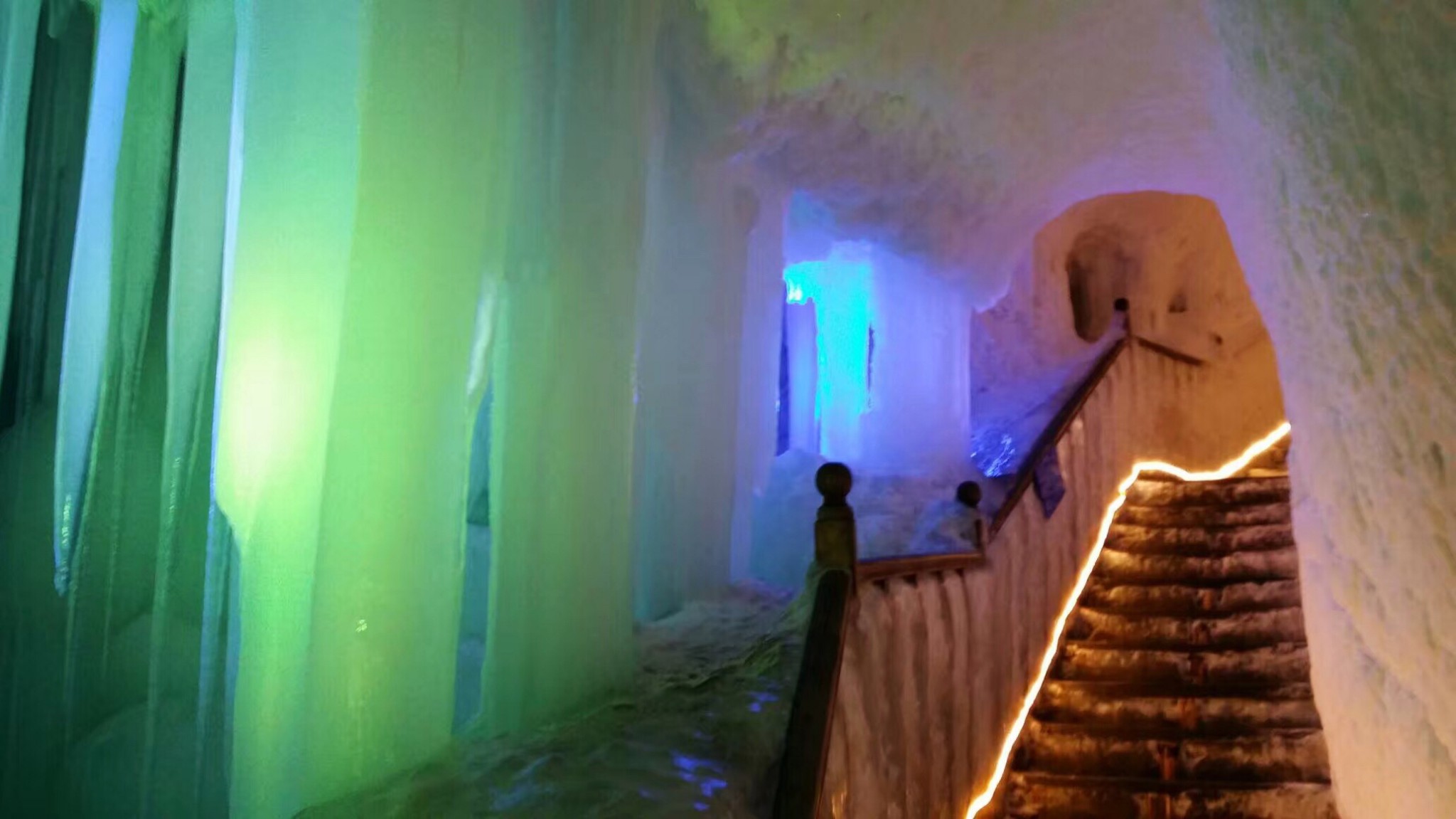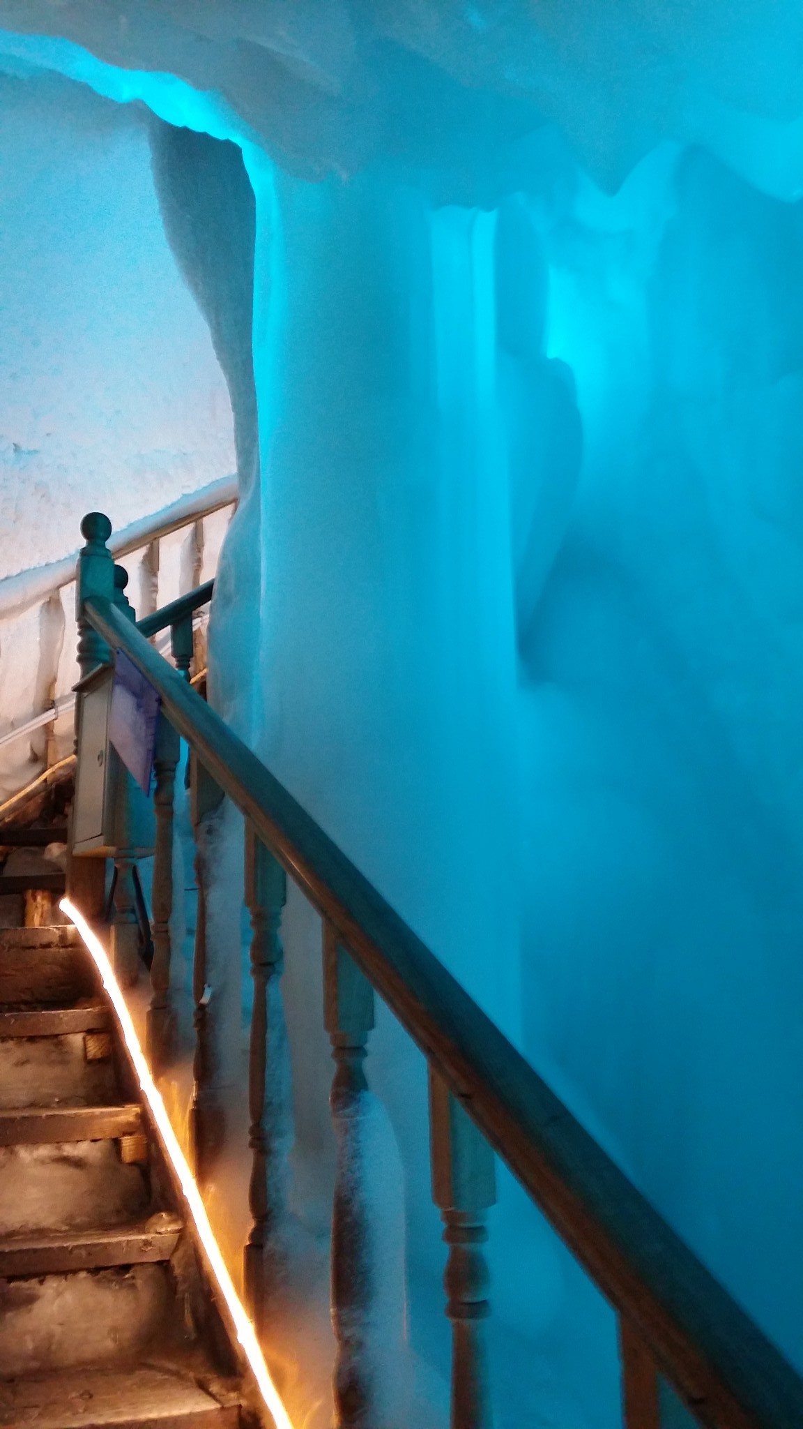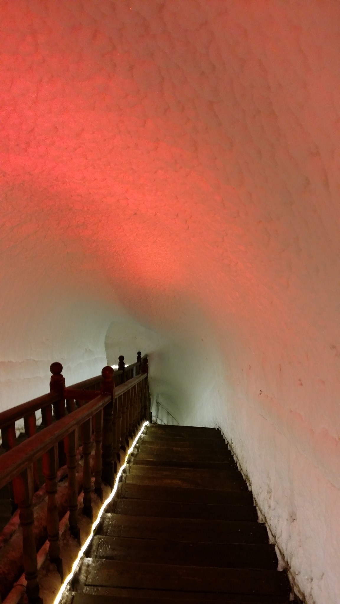 冰洞分成上下多层,进入冰洞,人们要钻冰洞,下冰梯,过冰栈,如行走于冰仙世界。万年冰洞的洞体基本是垂直的,沿着盘旋的木栈道慢慢走,也就一个多小时就能在冰洞里转了一圈,里面的路都是单行线,不能走回头路,以免人群多的时候,还便于控制人流。现在是盛夏啊。